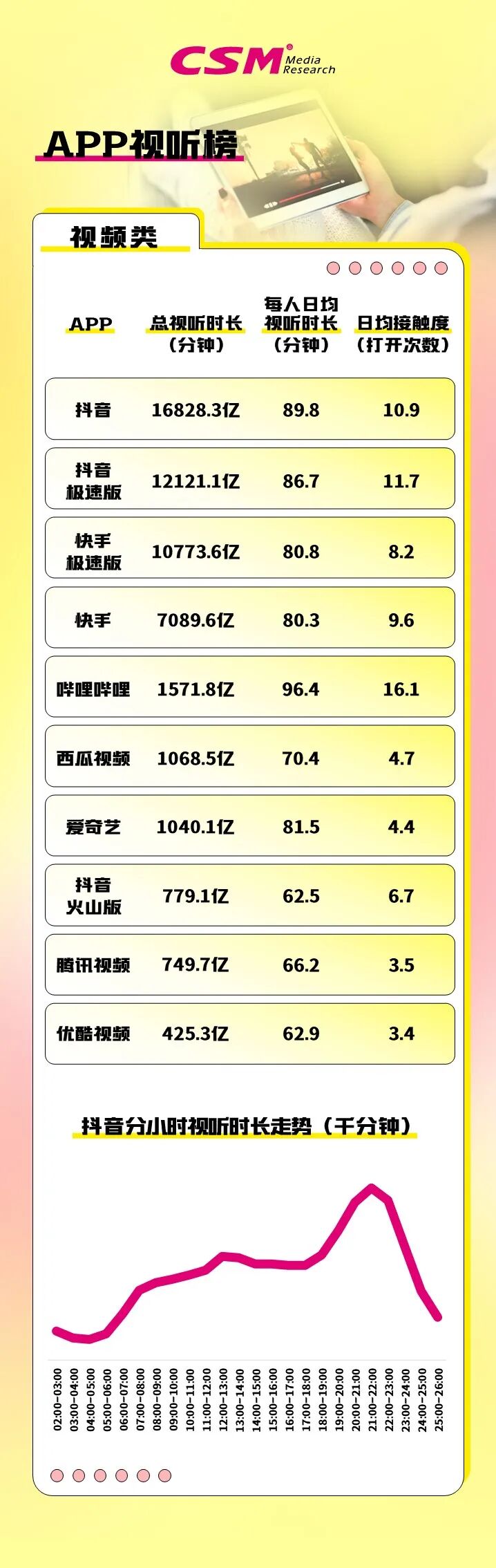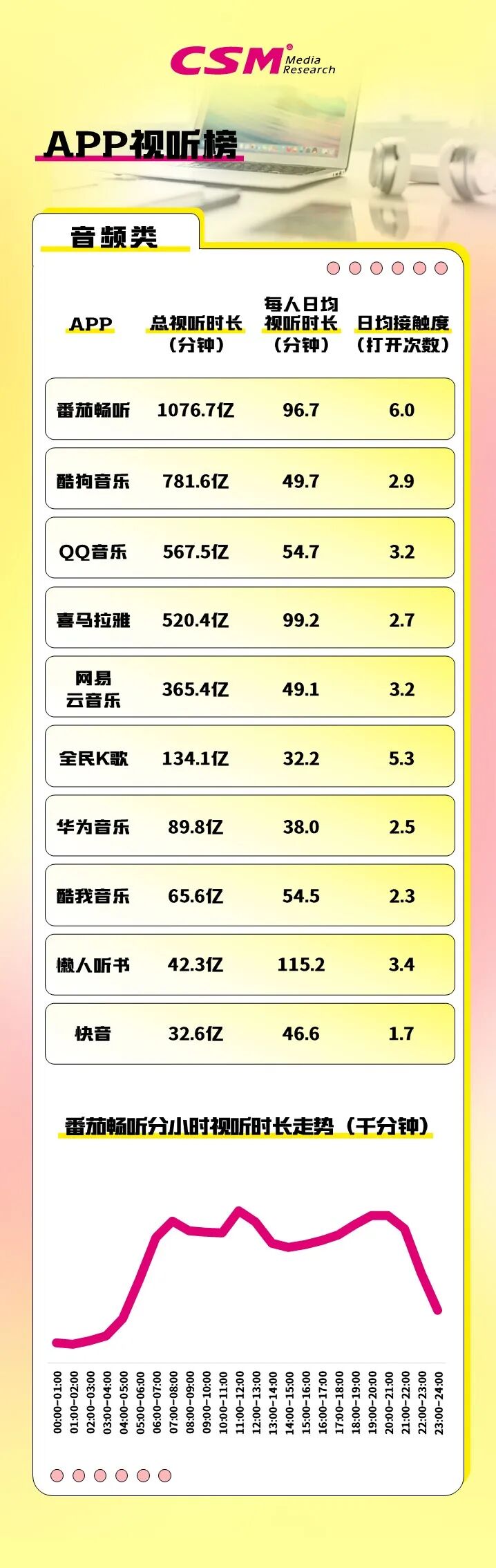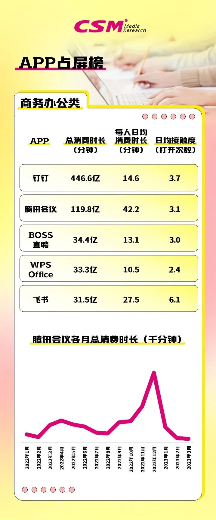 中国广视索福瑞媒介研究(简称 CSM)基于CSM全媒体视听同源数据(New TAM),对垂直APP细分研究。本期挑选【音频】【视频】【社交通讯】【商务办公】和【运动健康】五大垂类,发布2023年一季度垂类应用APP影响力洞察,通过各垂类中较具代表性APP的总消费时长分天趋势和月度趋势,演绎用户“掌中”不同领域在同时空的“精致生活”,供业界参考。