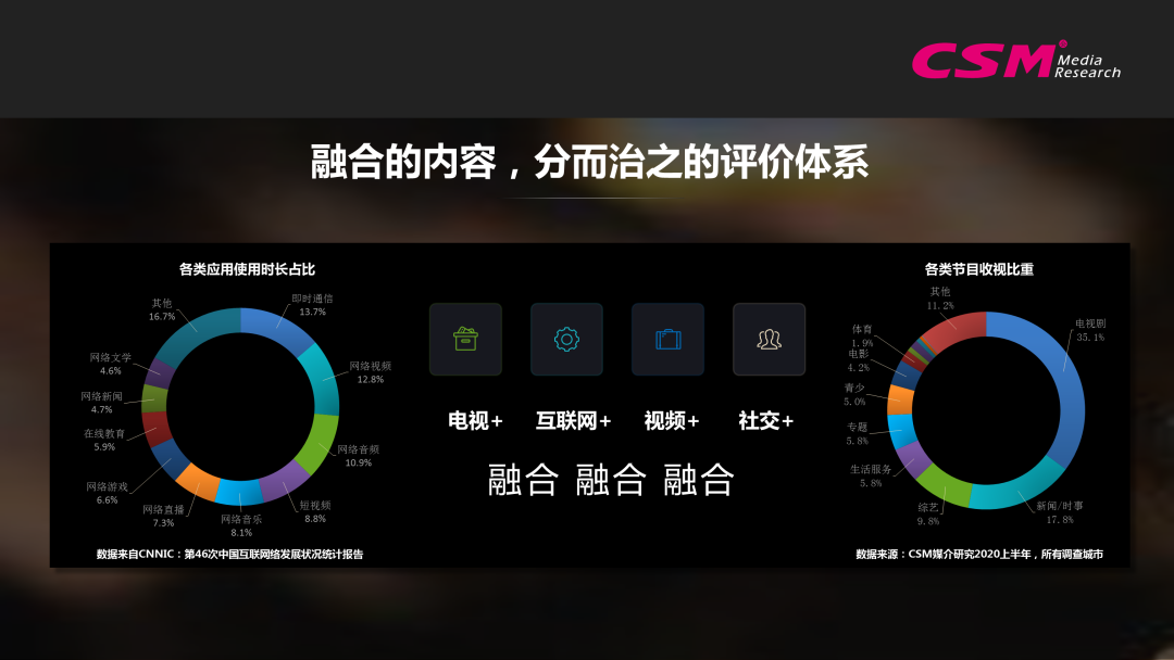 解决这个问题的主要方案是建立一套权威、标准的数据标准体系,实现跨平台的数据统一,这也是目前数据市场所面临的难题。从目前来看,我国媒体融合的方向主要还是在尝试做内容的加法,打通产业链;大屏电视、长视频平台、短视频平台以及具有社交媒体属性的互动平台都在互相布局。微信推出的视频号功能,西瓜视频尝试做中长视频的思路,都是内容加法的一种应用。所以,未来的媒体生态其实是一个共生共荣的内容生态。那么,我们的数据生态也就是评价体系如何呢?如下图所示,左边是CNNIC发布的第46次《中国互联网络发展状况统计报告》的数据,其中网络应用包括即时通讯、网络视频、音频、短视频、网络音乐、网络直播、游戏、在线教育、网络新闻、网络文学和其他。右边是2020年上半年CSM所有调查城市当中各类节目的收视比重,其中包括整个电视媒体的三大支撑:综艺、新闻及电视剧,其次还包括生活服务专题、青少电影、体育等。大家一般引用的大屏端数据是CSM的,互联网端数据是CNNIC的,但这两套数据是完全没关系的。换句话说,这两套数据的评价内容是共融共生的,但评价体系却是分裂的。所以,我们不仅需要建设一个共生共荣的内容生态,也要建设一个共生共荣的评价体系。