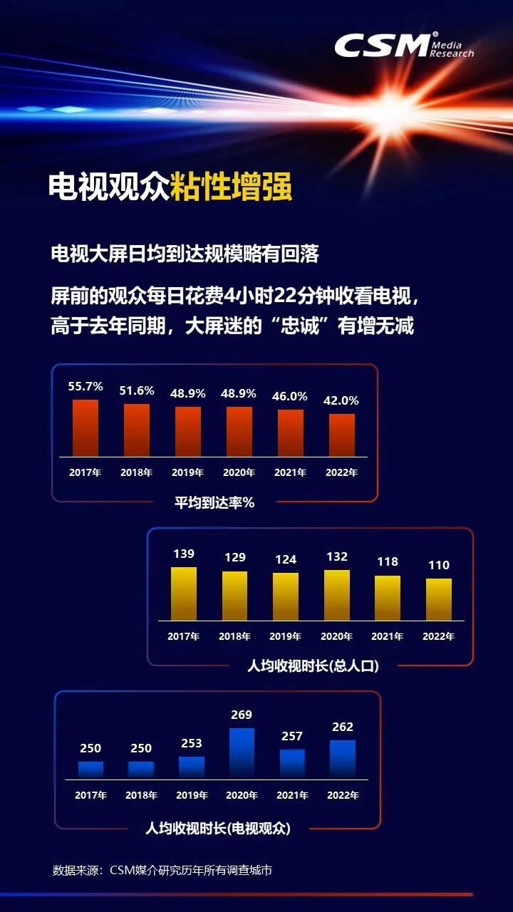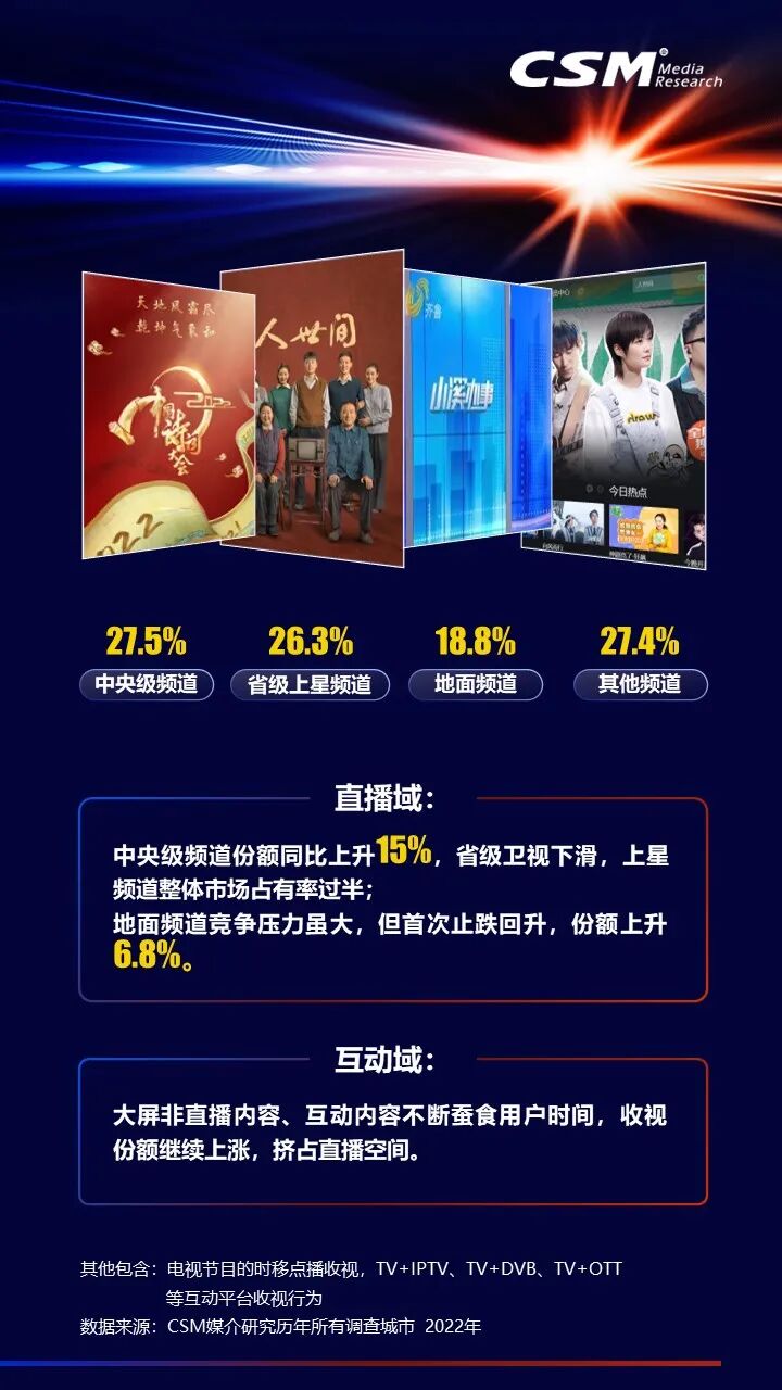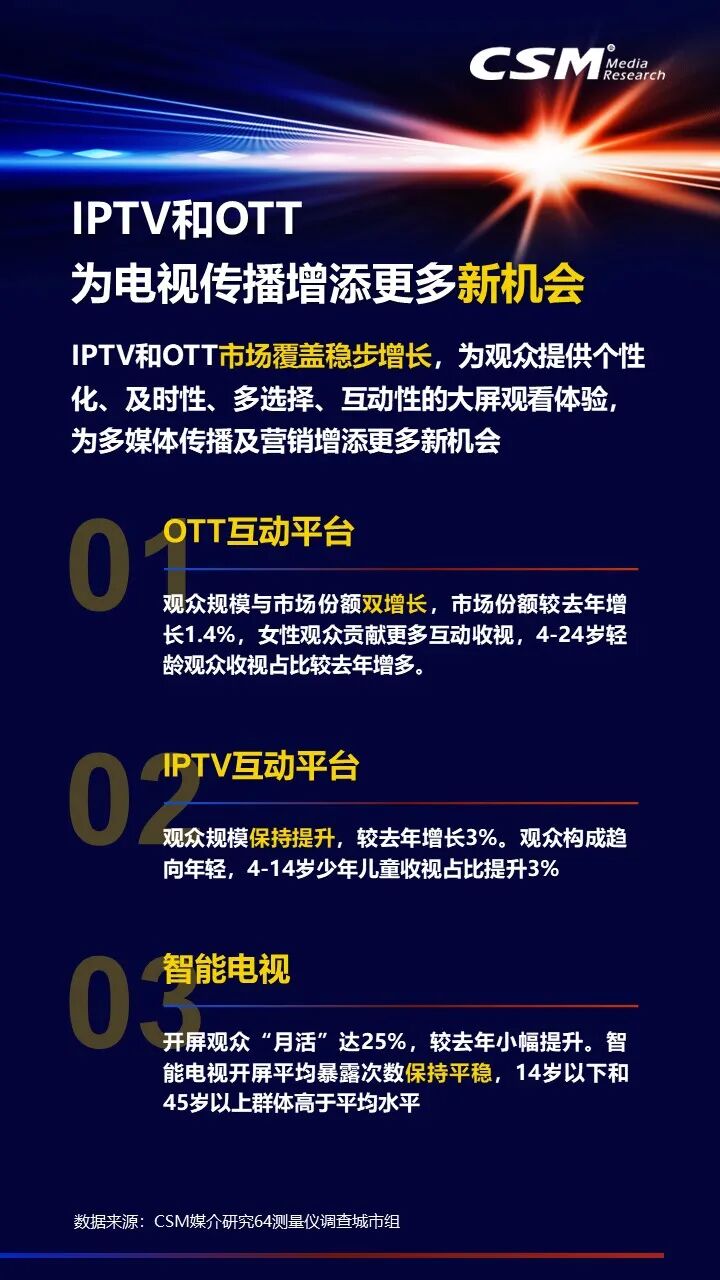 电视大屏观众存量可观,全年共25个频道观众“月活”规模超2.5亿人,观众粘性增强,较2021年人均收视时长(电视观众)增长5分钟。与此同时,在直播领域,中央级频道份额同比上升15%,以回看点播等为代表的非直播内容收视份额逐年提升。IPTV和OTT的市场覆盖稳步增长,为多媒体传播及营销增添更多新机会。