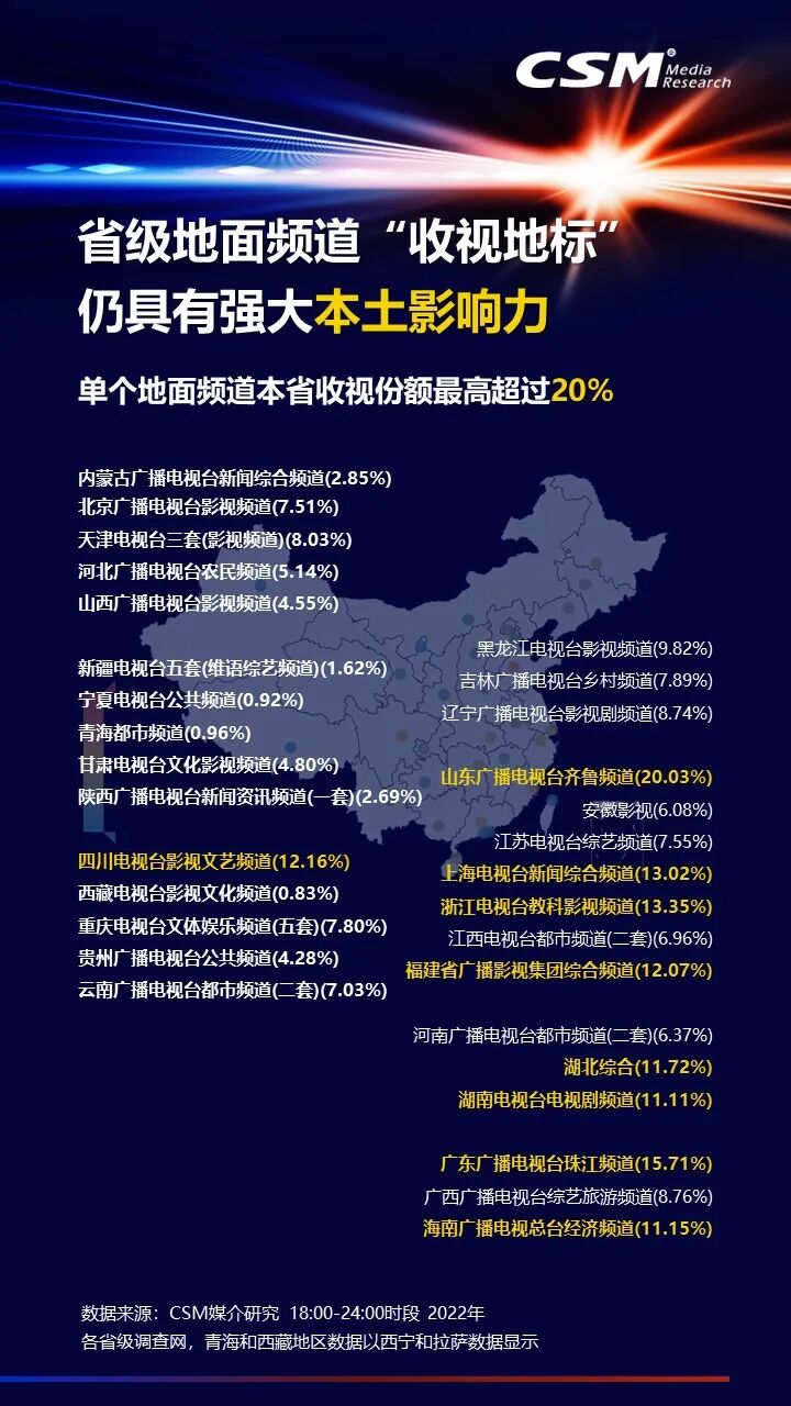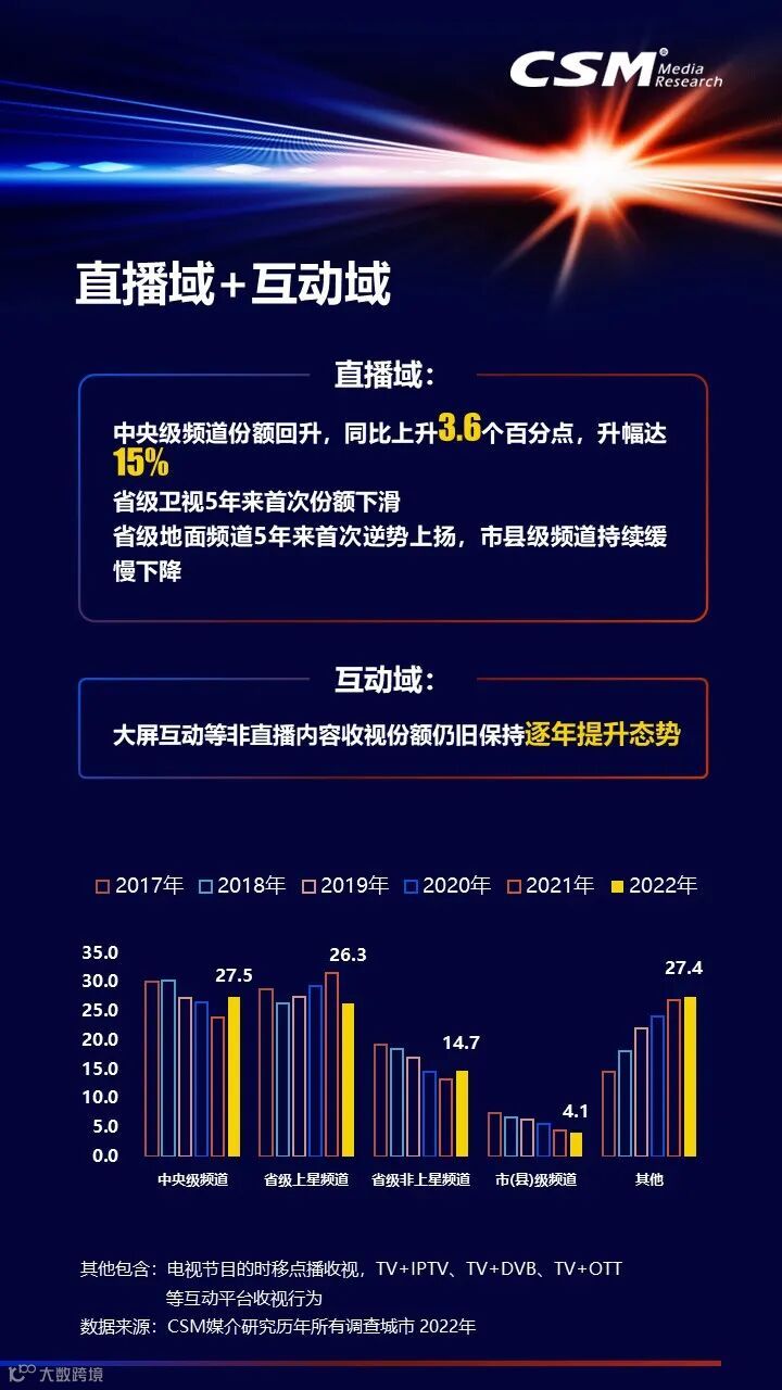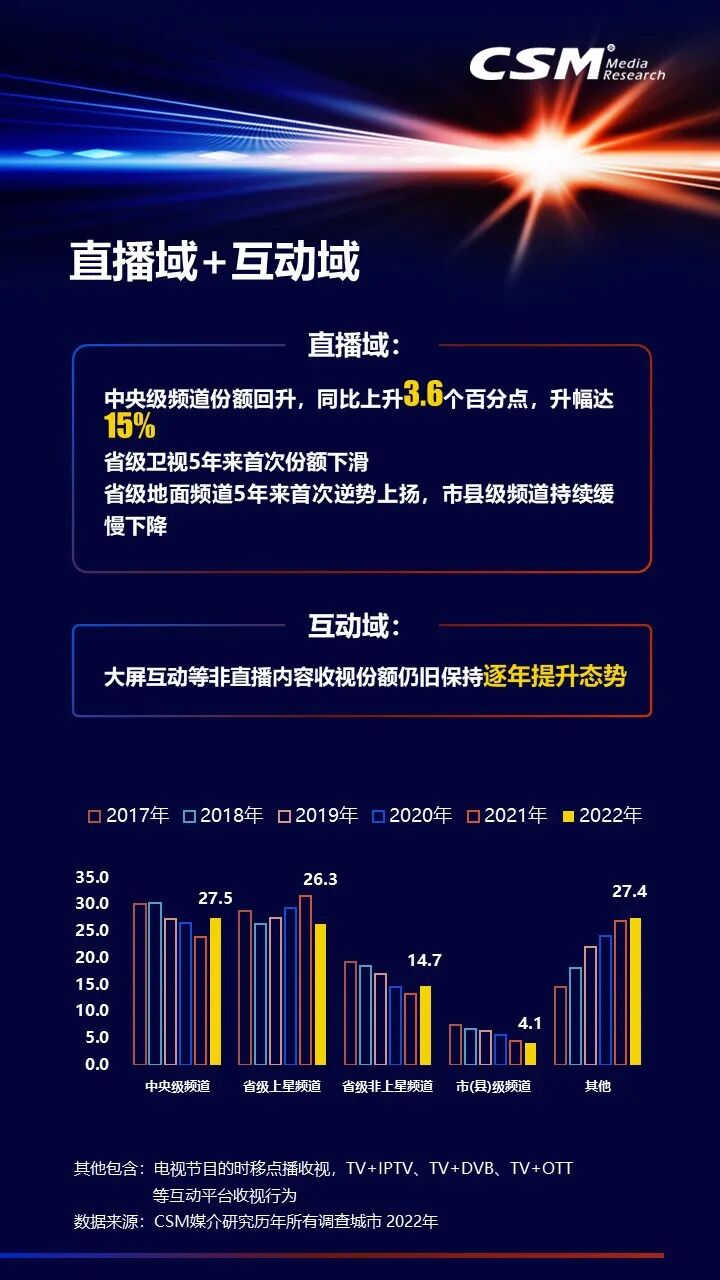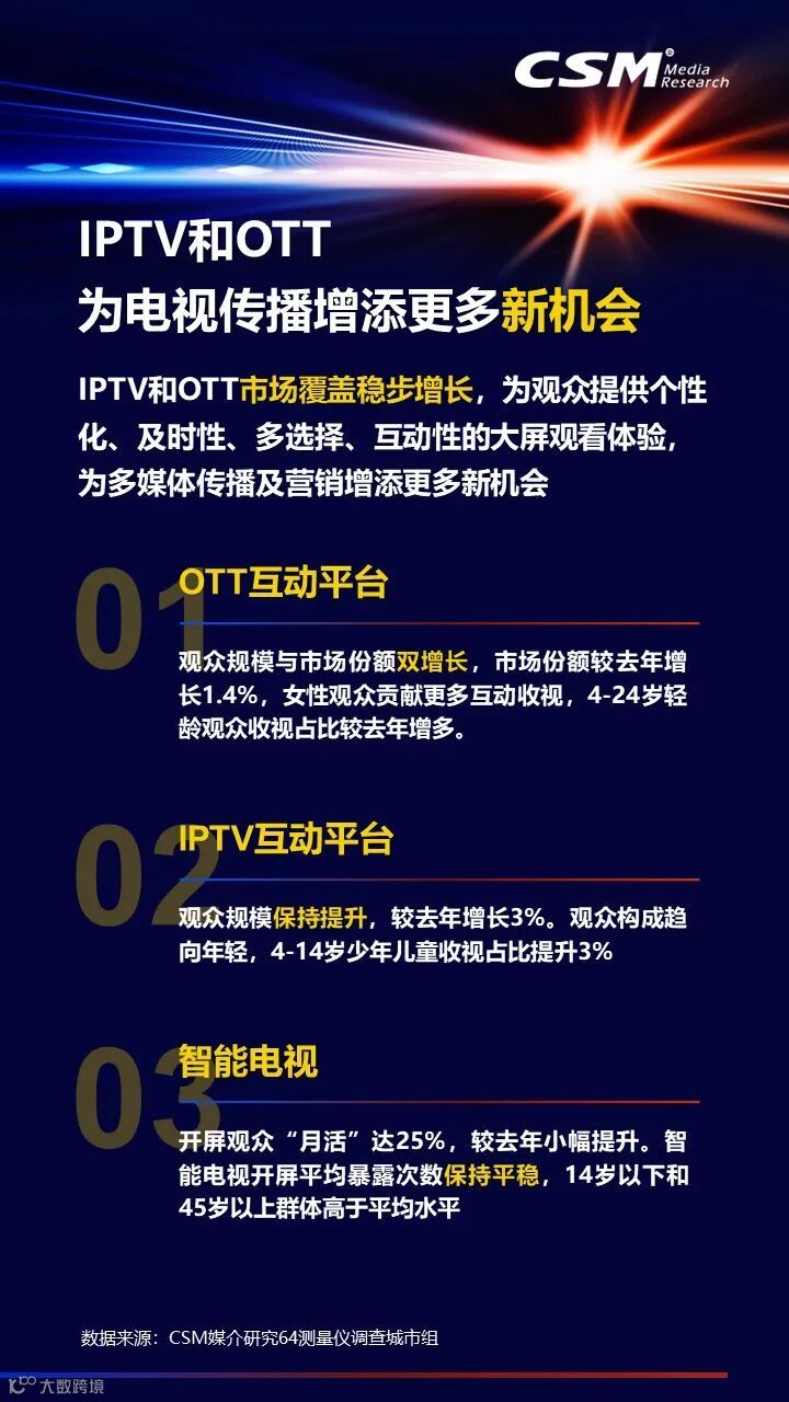 电视大屏观众存量可观,全年共25个频道观众“月活”规模超2.5亿人,观众粘性增强,较2021年人均收视时长(电视观众)增长5分钟。与此同时,在直播领域,中央级频道份额同比上升15%,以回看点播等为代表的非直播内容收视份额逐年提升。IPTV和OTT的市场覆盖稳步增长,为多媒体传播及营销增添更多新机会。