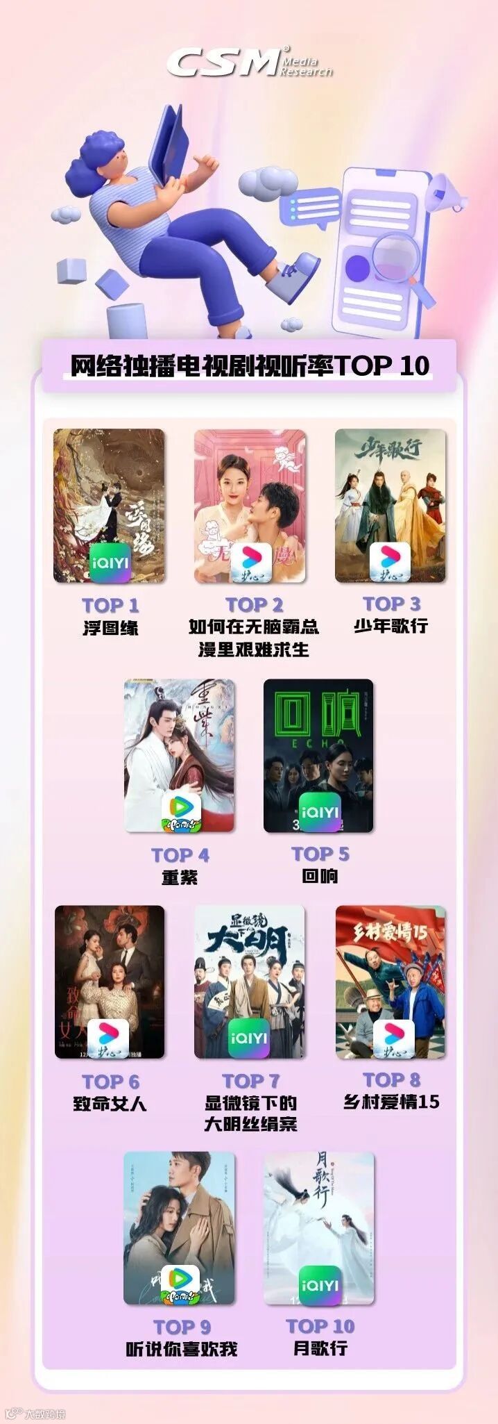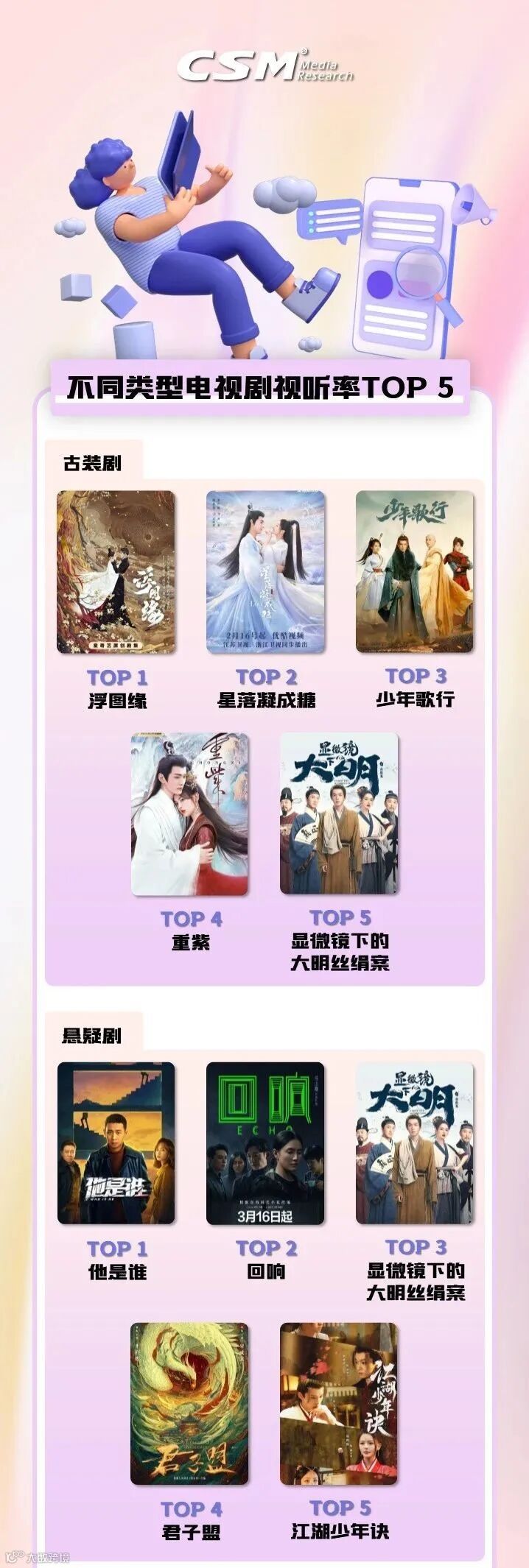 从剧集题材看,悬疑剧、古装剧和喜剧更受大众所关注,比如看破生活与觅得真相的悬疑剧《他是谁》、将现代意识内置于历史故事的权谋古偶剧《浮图缘》和讲述职场新人成长之路的当代喜剧《如何在无脑霸总漫里艰难求生》,在不同类型视听率TOP榜中位列榜首。