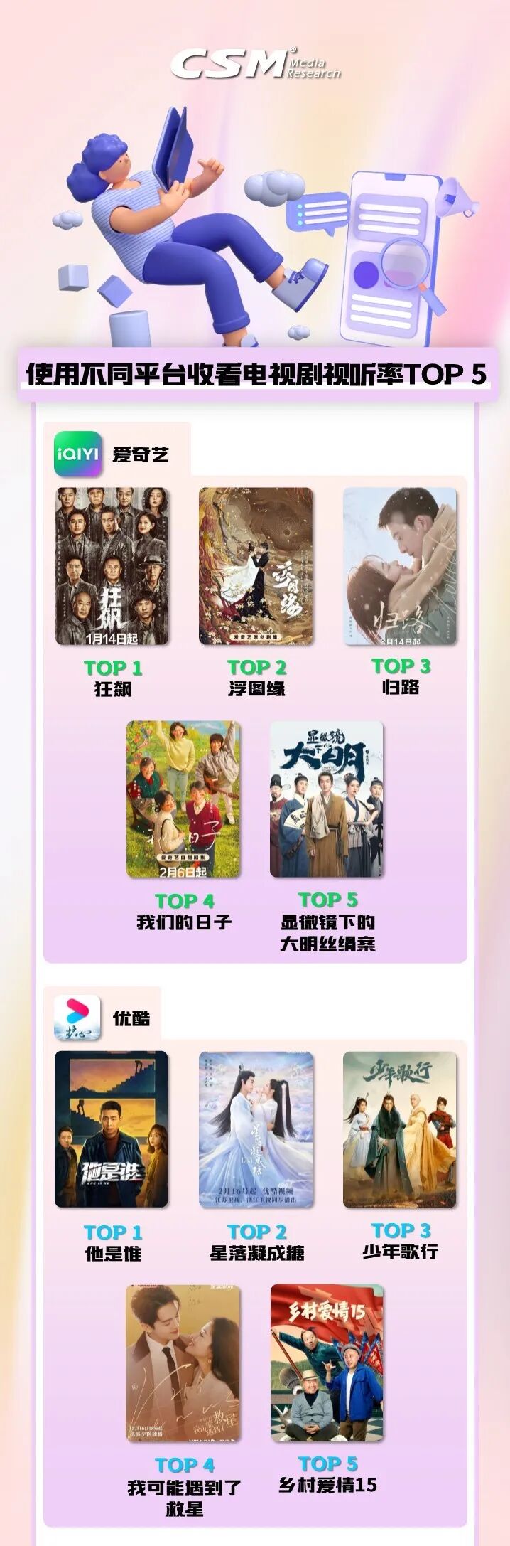 从长视频平台看,台网联播剧《狂飙》《他是谁》《重紫》和《去有风的地方》喜夺一季度使用爱奇艺、优酷、腾讯和芒果TV平台收看电视剧视听率TOP榜魁首。