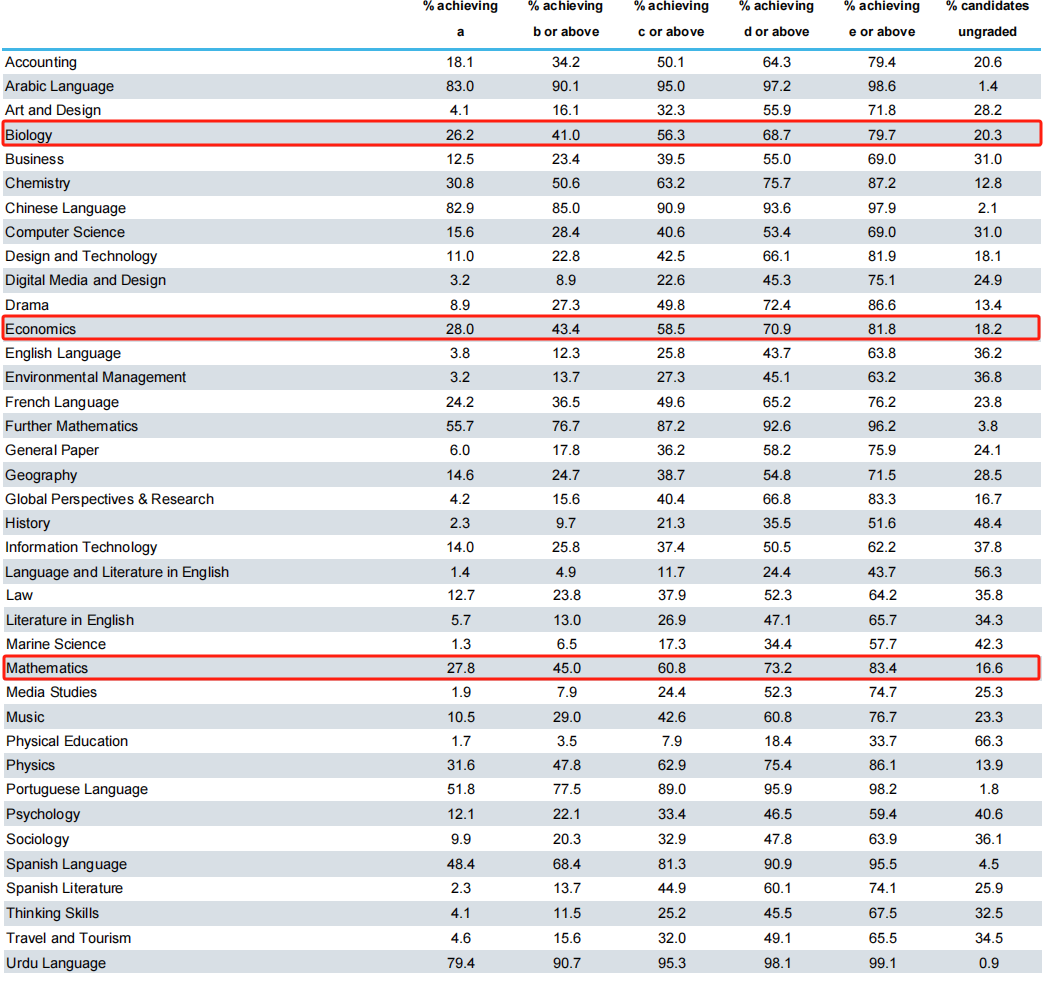 我们主要还是来看中国学生选择的热门学科,他们的A*率分别为: