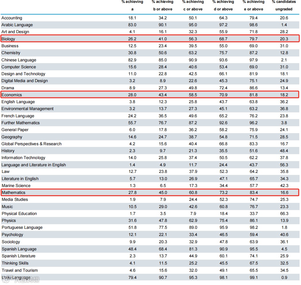 我们同样以中国学生常选择的热门学科为例,对三大考试局今年夏季考的成绩做一个简单的比较。如图所示: