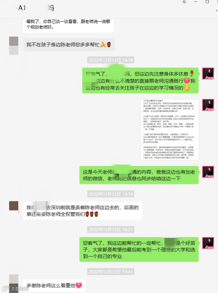 另外我手上目前服务的孩子应该有100来个左右,要定期给到每个家长回访是不现实的。所以我更希望的是家长如果有想了解的部分,主动来找我沟通。而确实有些家长会定期过来与我沟通孩子的成绩,跟我说孩子阶段性的成长,我再给到他们反馈。这其实是额外的服务,但如果对方主动去做,我们就会认真对待。