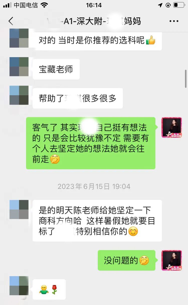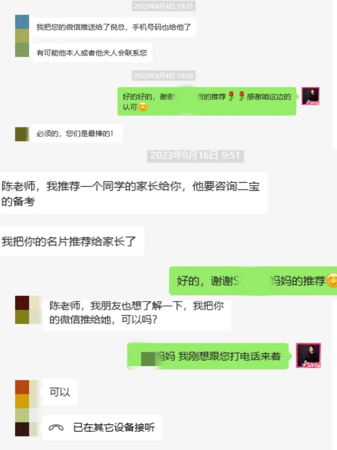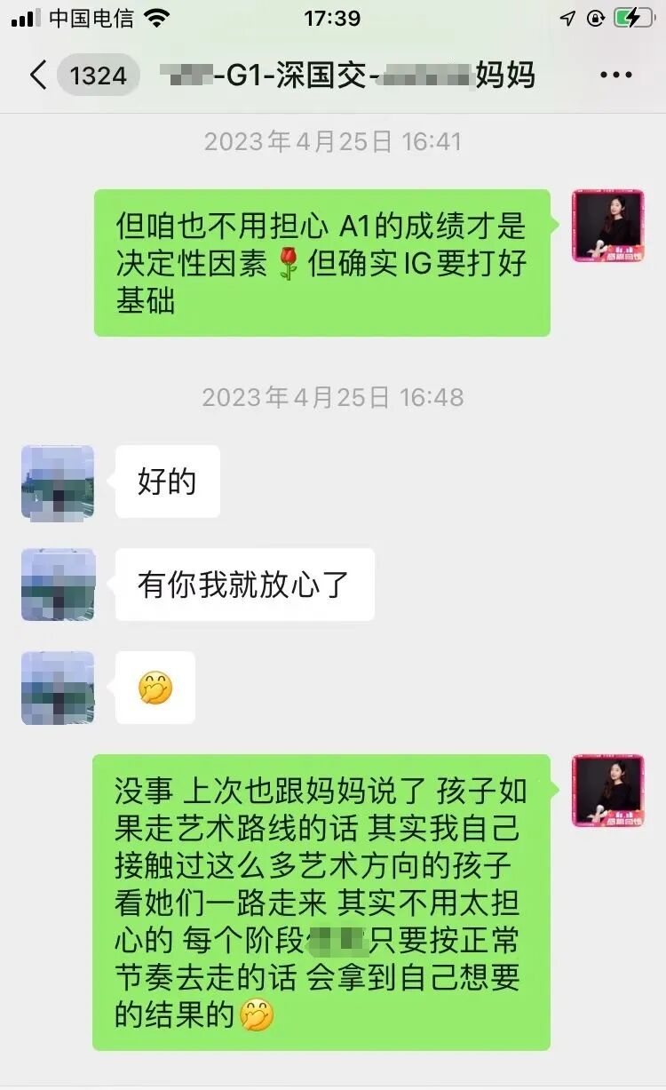 我也有不少家长会主动跟我沟通这些情况。因为他们会发现你是认真在做服务,你真的是在为孩子考虑,这时候家长不管是有什么问题都会来找你。原本我只是一个课程顾问,但当家长产生信任时,会让我帮忙给孩子做规划,当发现孩子出现心理问题时,甚至让我帮忙去找心理医生。所以到最后我不仅仅是一个课程顾问的角色,而是孩子整体的规划师。这也是我给自己的定位。