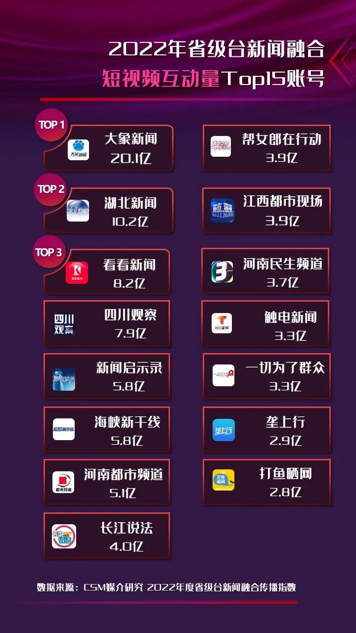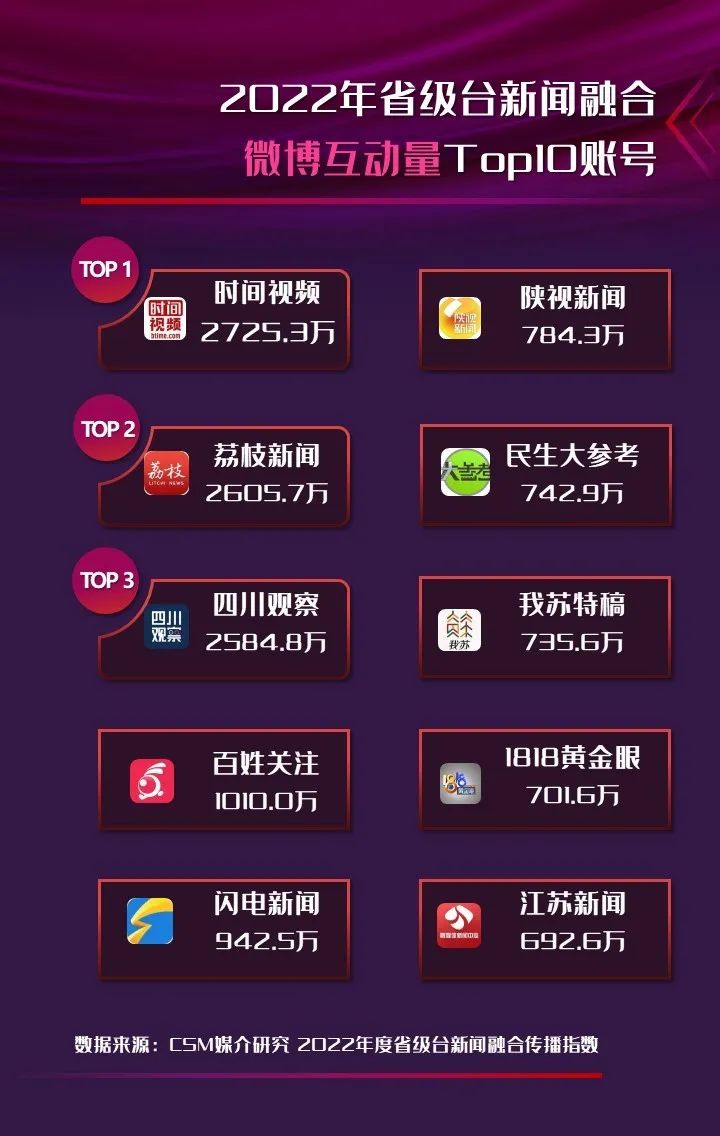 河南台频道、节目、融媒账号共同发力,带动河南台跃居省级台新闻融合微博传播指数首位。其中,节目账号@民生大参考、@小莉帮忙、@河南都市报道、@打鱼晒网,频道账号@河南都市频道和融媒账号@猛犸新闻、@大象新闻的账号互动量均超百万,合力贡献台内96.5%互动量。