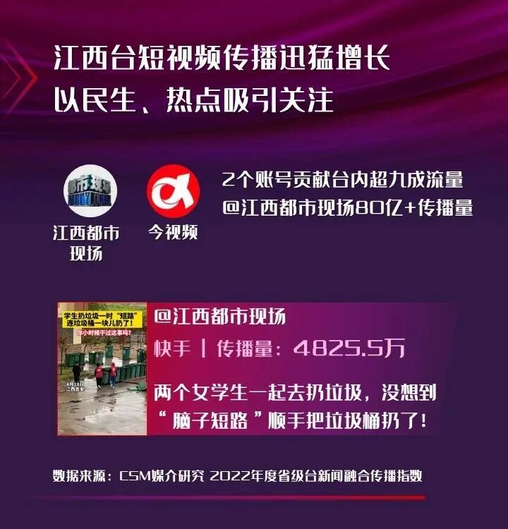 江西台成为2022年“黑马台”,新闻融合传播年度指数挺进前十。江西台短视频深耕新闻资讯、民生服务等内容领域,并在微信传播的共同助力下,大幅提升新闻融合传播效果。