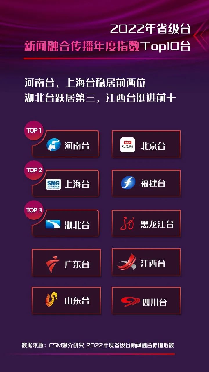 2022年,省级台新闻融合传播头部阵营竞争依然激烈。随着主力军全面挺进主战场,网络传播对新闻融合整体传播效果的影响持续强化,从2022年新闻融合传播年度指数来看,跻身年度指数前十的省级台,也是进入新闻融合网络传播指数前十的台,其中湖北台、黑龙江台、江西台的网络传播指数排名赶超大屏。