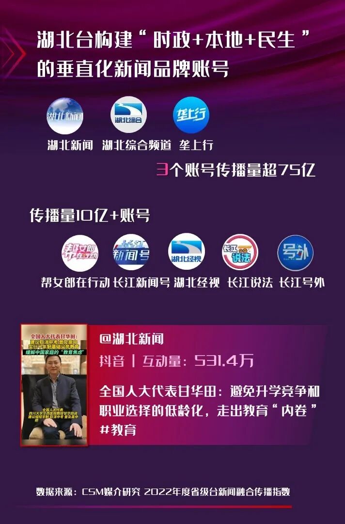 湖北台在短视频传播效果提升的驱动下弯道超车,新闻融合传播年度指数跻身省级台第三。湖北台深耕时政及民生新闻,优化生产流程,持续将大屏品牌转化为融合品牌,打造了一批有网端影响力的新闻账号。