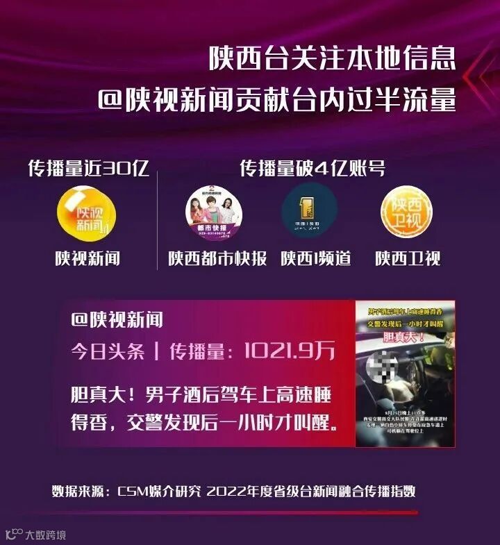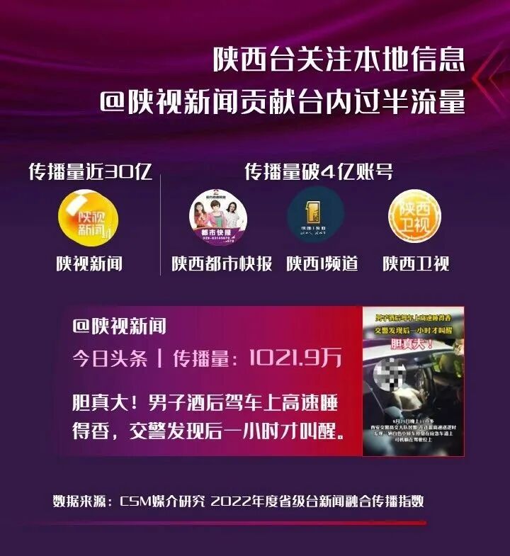 陕西台保持在新闻融合短视频传播指数前十,@陕视新闻为主力账号,聚合全网和台内资源、紧跟国内外热点新闻/事件,以29.6亿传播量居台内首位,贡献台内55.6%的传播量;@陕西都市快报、@陕西1频道、@陕西卫视更侧重本地民生、疫情资讯内容,传播量皆破4亿。