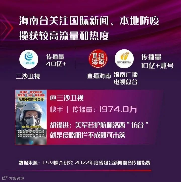 海南台新闻融合微信传播指数排名显著提升、继2019年第二次进入前十名。@直播海南传播量较2021年上涨60.6%,贡献台内超六成流量。