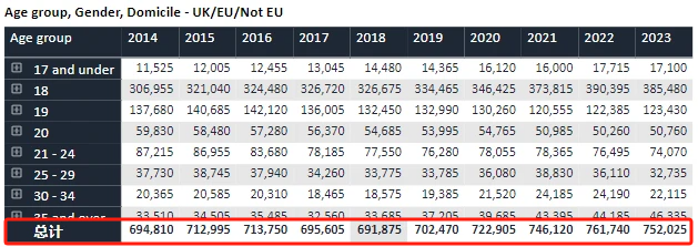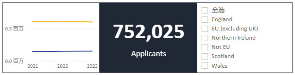 总申请数为752025人,去年为761740人,申请人数有所下降,但下降人数主要在英国本土,国际生申请人数仍有所上涨。