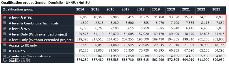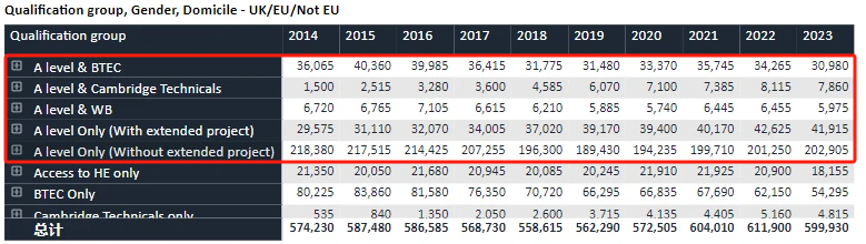 从申请大学的资格这一栏来看,A-Level仍是申请的重要门槛,众多学生选择了这一项成绩。你可以选择A-Level+EPQ,也可以不加,但可以看出有不少学生使用了EPQ的成绩。