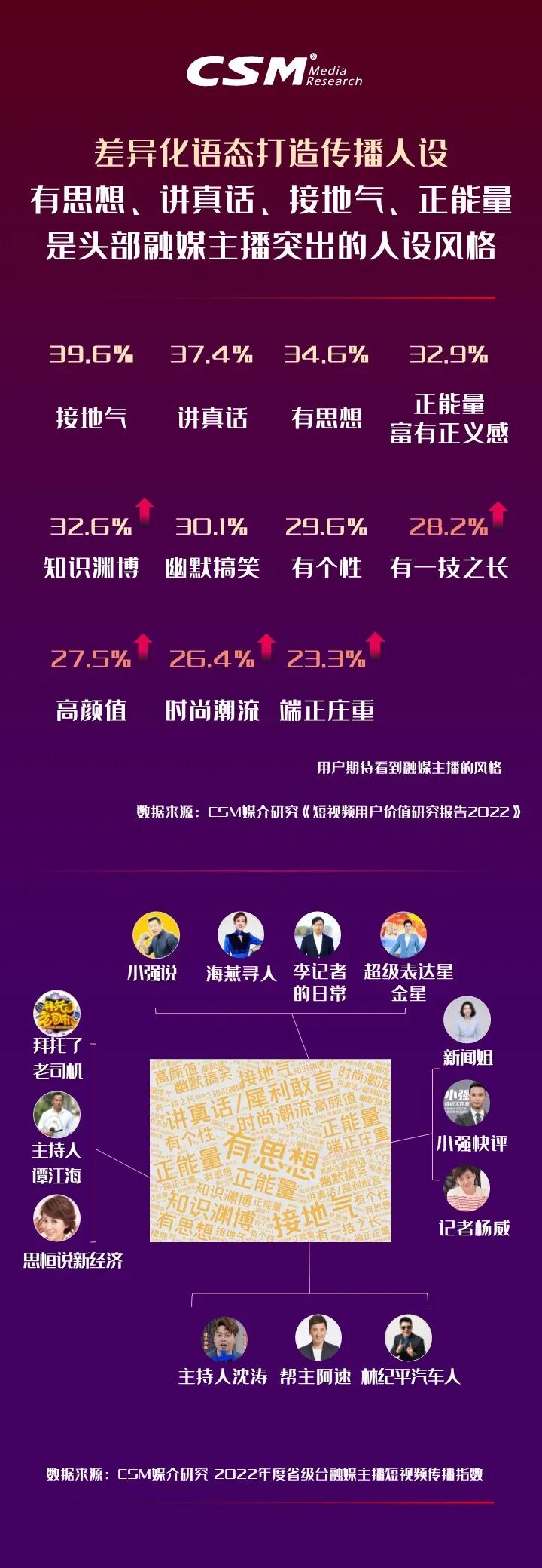 通过观察2022年省级广电融媒主播短视频传播指数TOP50的主播账号发现,省级广电融媒主播突出的人设风格印证了CSM短视频用户调查的相关数据,同时普遍呈现出客观、理性而又不失温度的特点;部分主播通过独到的观点、有态度的表达、丰富的知识储备、多元的表现形式等差异化传播语态打造个人IP。