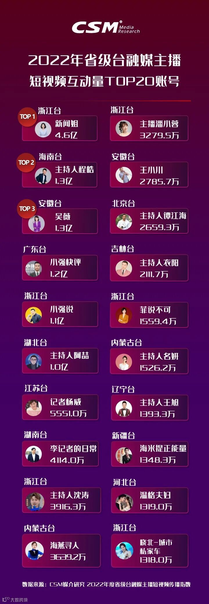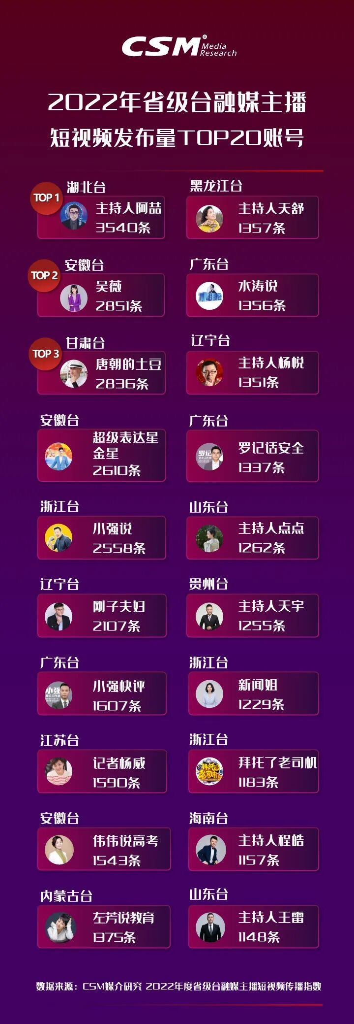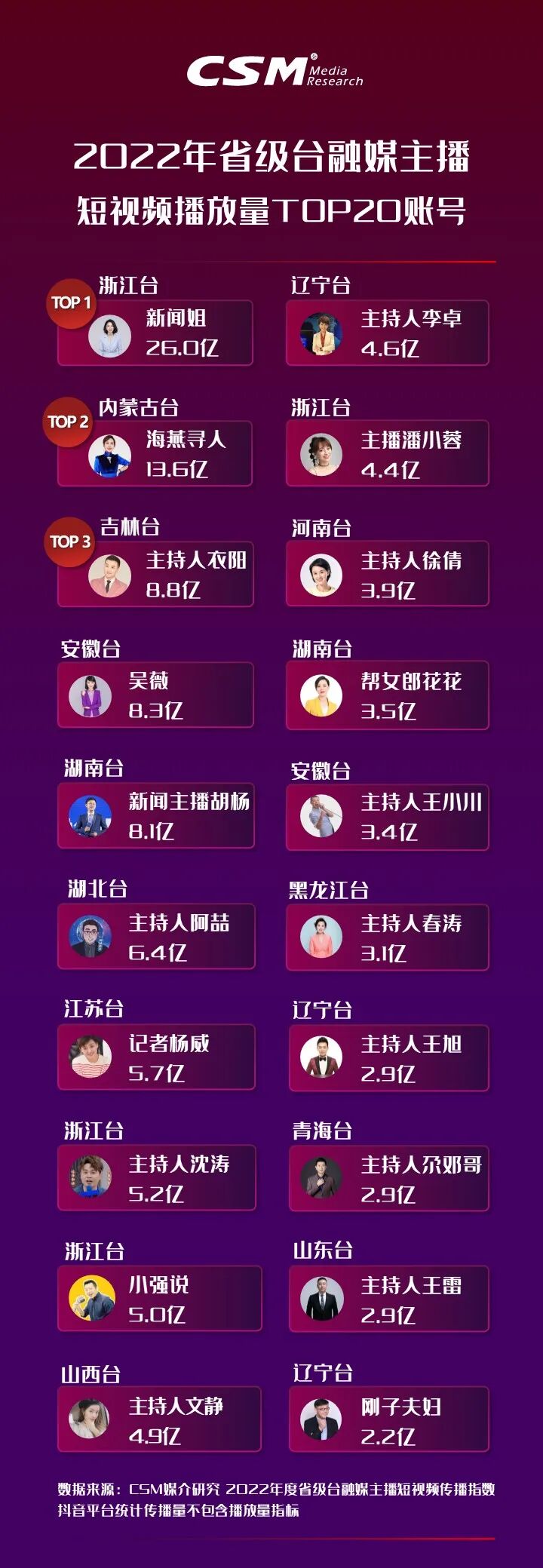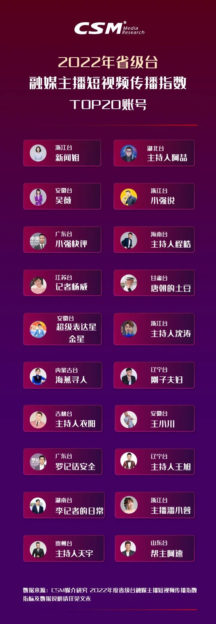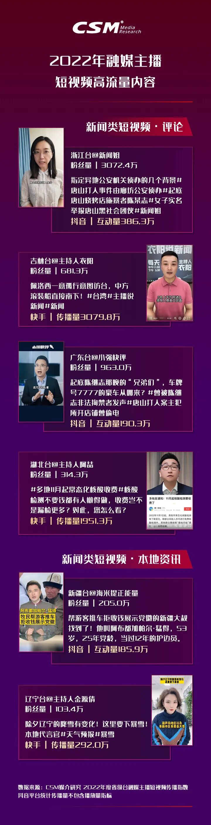 在加快推动媒体融合深化发展进程中,广电机构的主持人、记者、编辑、制片人等加速竞逐短视频赛道,以“融媒主播”的身份深度介入传播的全流程,同时以更接地气的表达方式拉近与受众的距离。CSM媒介研究以短视频传播为切入口,持续关注广电机构融媒主播的创作与传播情况,从主播传播的个体化视角综合观察媒体融合的发展。
