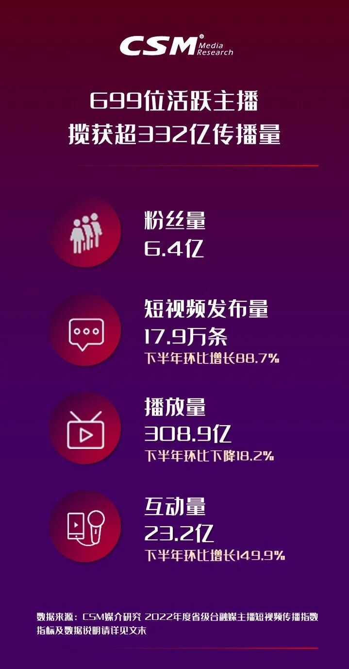 2022年,CSM媒介研究在抖音、快手等平台观察了2022年活跃主播699位,累计粉丝量6.4亿,发布短视频内容17.9万条,获得308.9亿播放量和23.2亿互动量。相较于上半年,下半年活跃主播账号发布量、互动量均有大幅增长,其中发布量增长88.7%、互动量涨幅达149.9%;同时,下半年播放量环比下降18.2%。