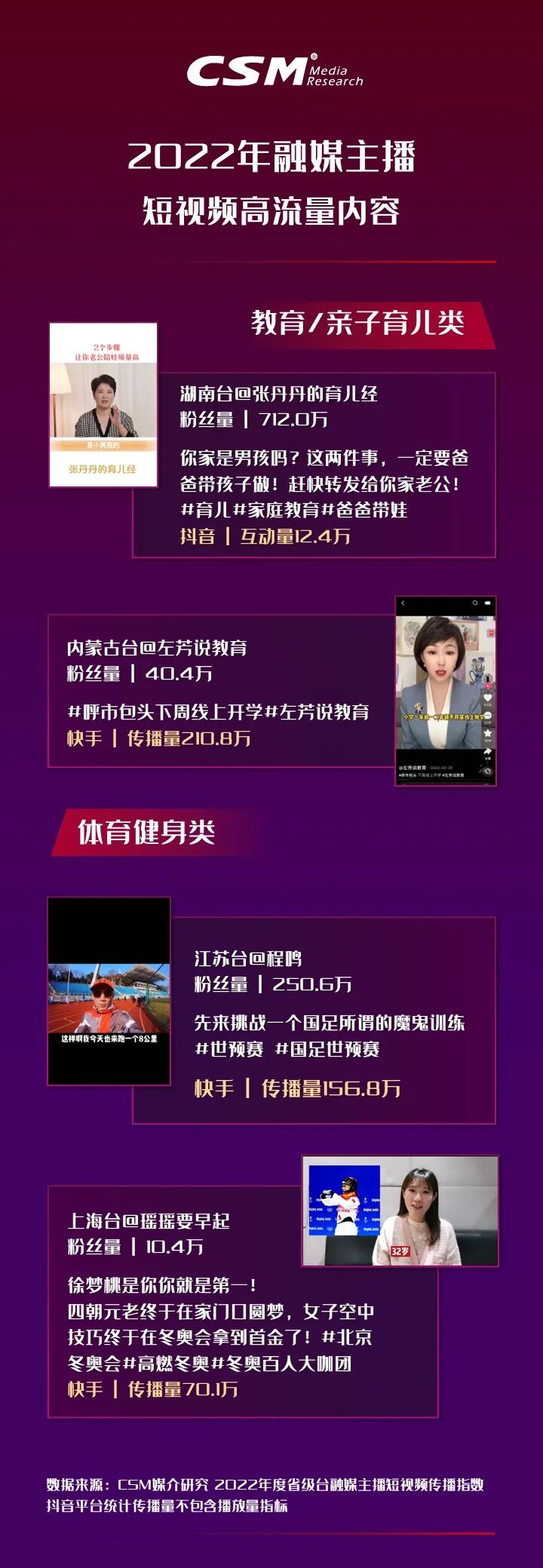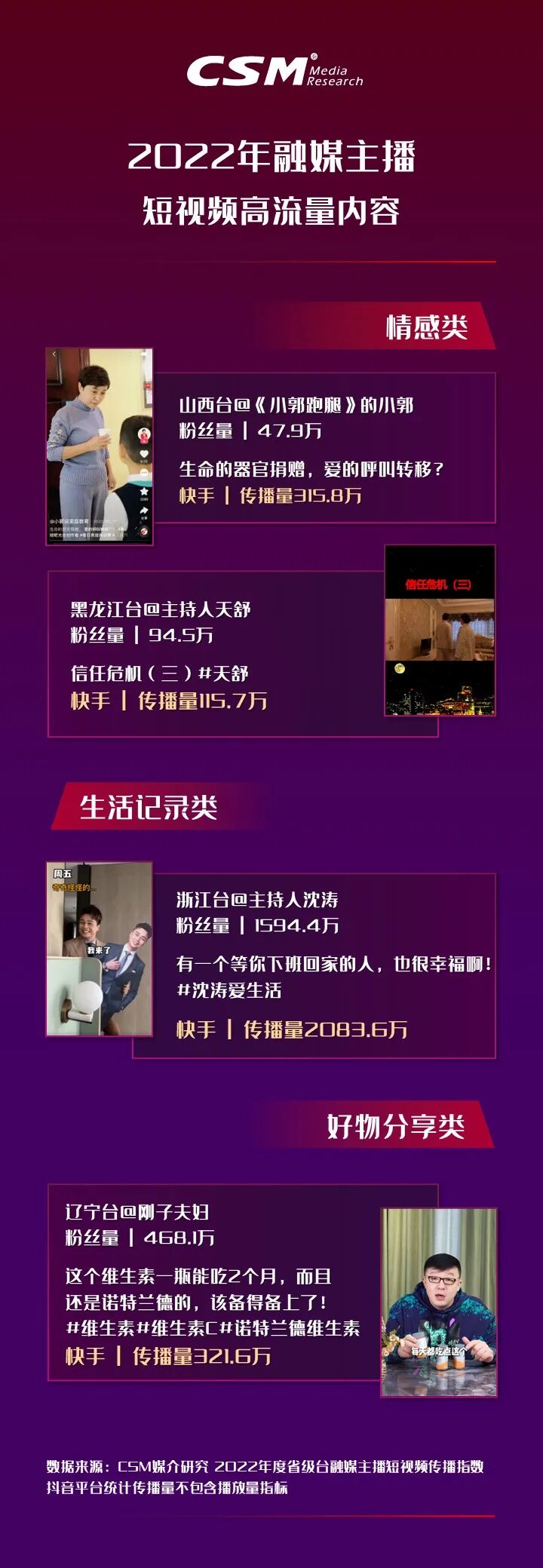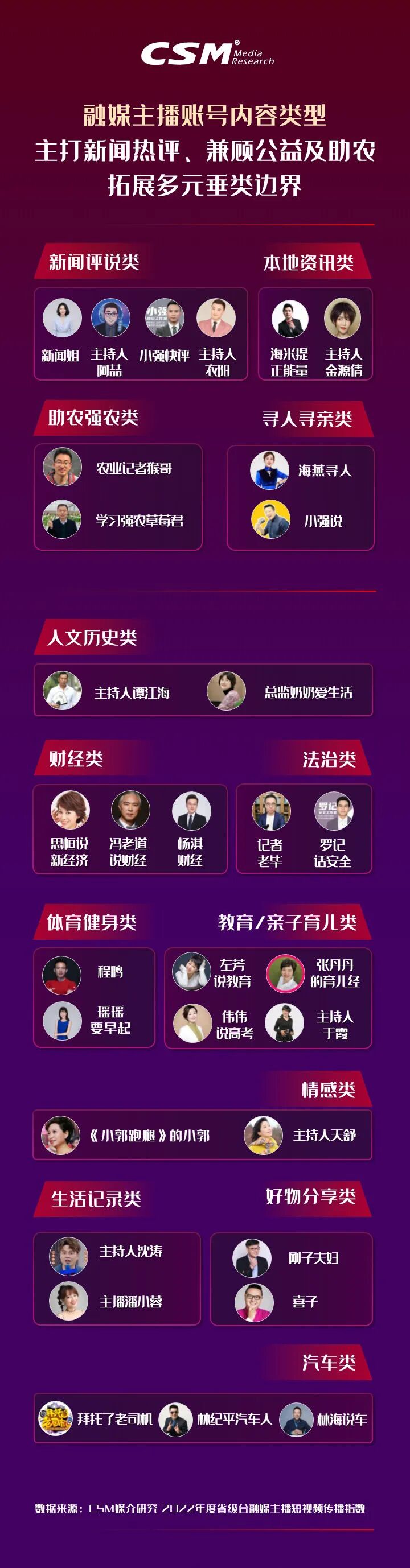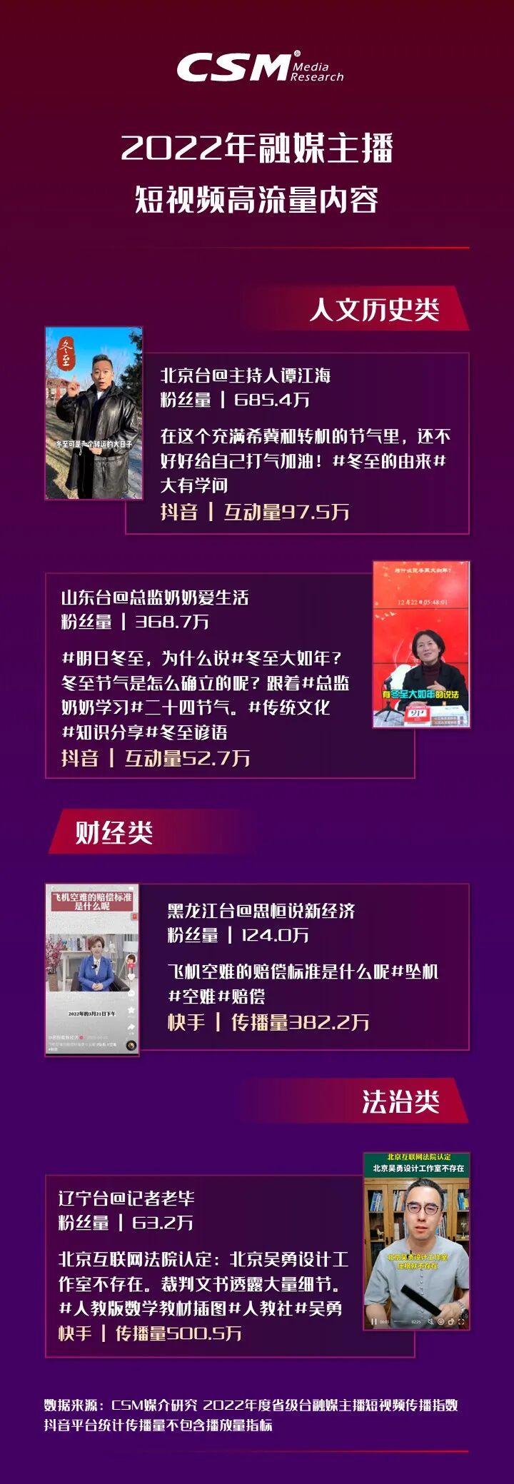 观察2022年省级广电融媒主播账号发现,主播积极发挥台内资源优势和自身专业性,发布内容主打紧跟社会热点的新闻解读、观点提炼等内容,同时包含助农强农、寻人寻亲等公益服务信息。另外兼顾扩展人文历史、财经、法治、体育健身、教育/亲子育儿、情感、生活记录、好物分享、汽车等垂类内容创作,融媒主播账号形成多元化、个性化的特色矩阵模式。