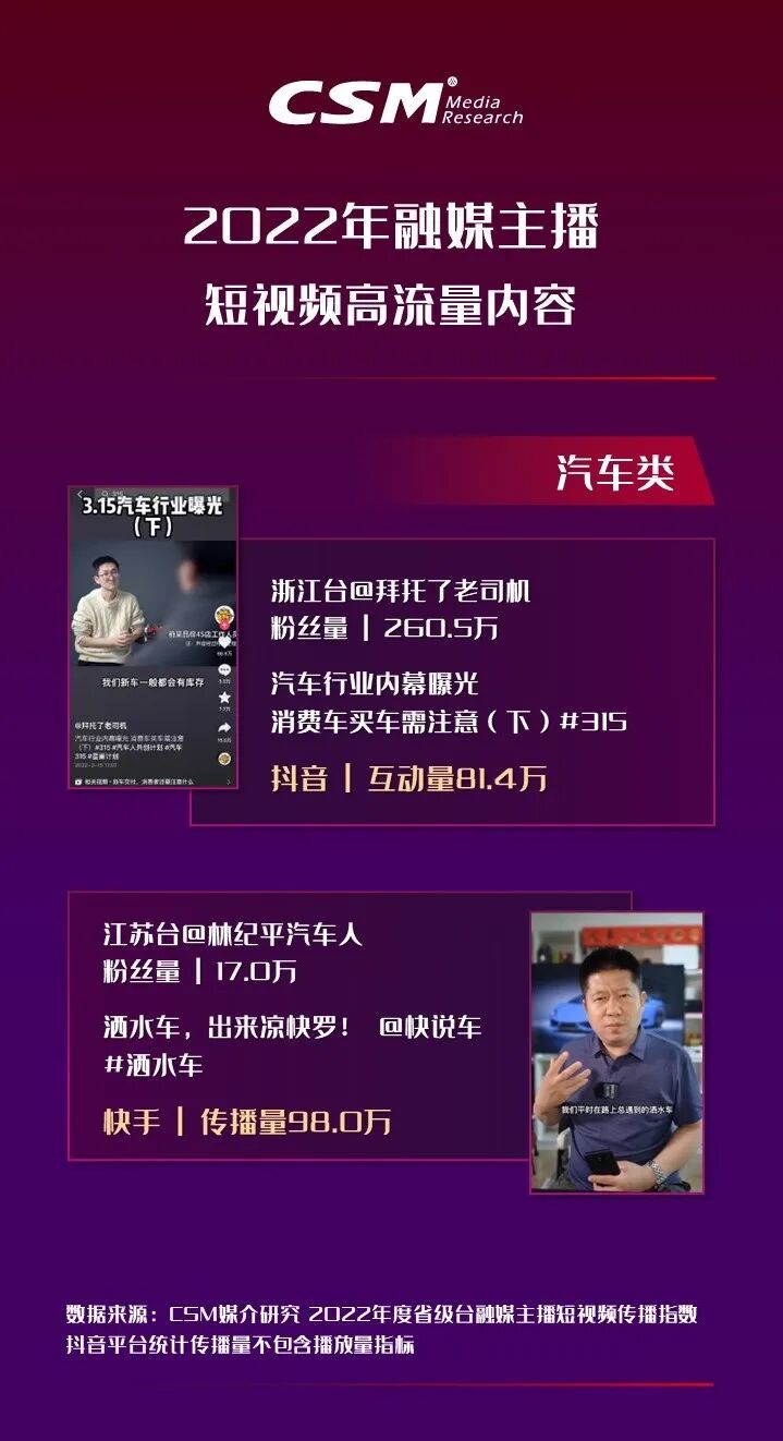 汽车类主播账号则是以测评推荐、相关政策等命中爱车懂车用户痛点。如浙江台@拜托了老司机、江苏台@林纪平汽车人、重庆台@林海读车均从剖析汽车的角度出发,以讲解推荐、性能/外观测评对比为主,买车注意要点、特斯拉新能源等内容获高关注度。另外,@拜托了老司机还创新内容呈现形式,以相声的寓教于乐形成自身鲜明特色。
