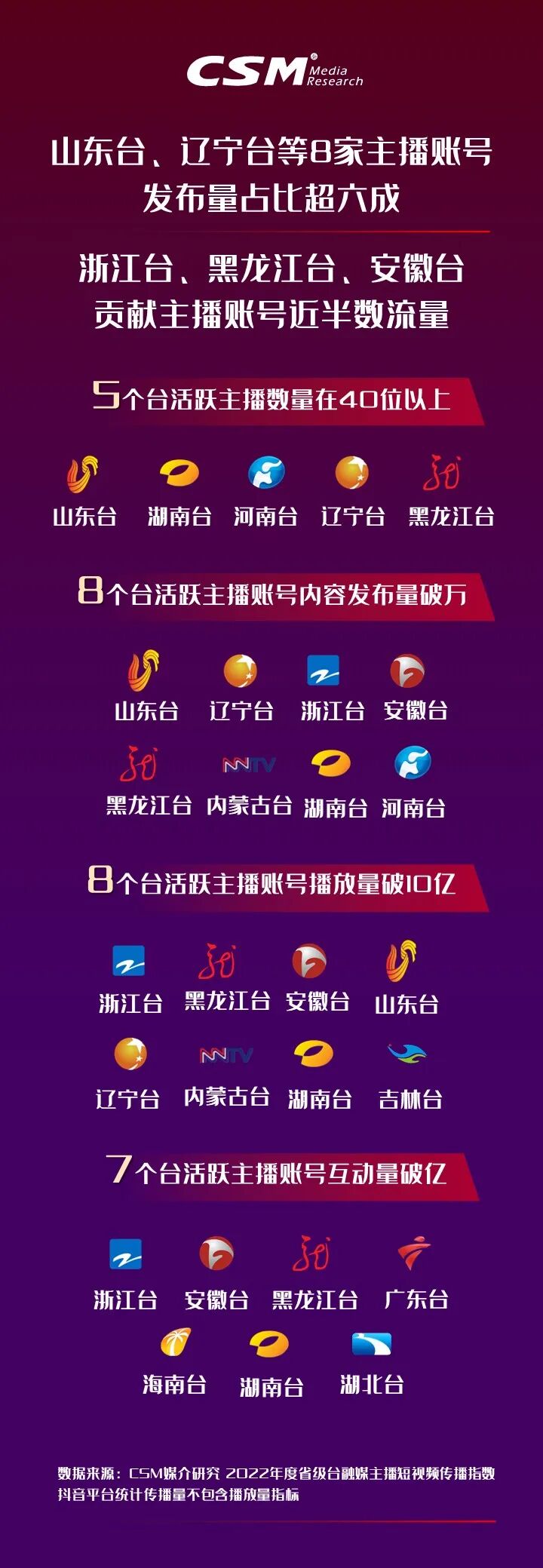 从各省级台活跃主播账号的互动量看,2022年,7家省级台融媒主播账号互动量破亿、贡献主播账号互动总量的75.2%。其中,浙江台主播账号以8.4亿互动量领跑,安徽台、黑龙江台主播账号分别揽获2.5亿、1.5亿互动量,位列第二、第三;广东台、海南台主播账号均以1.4亿左右互动量进入省级台前五。
