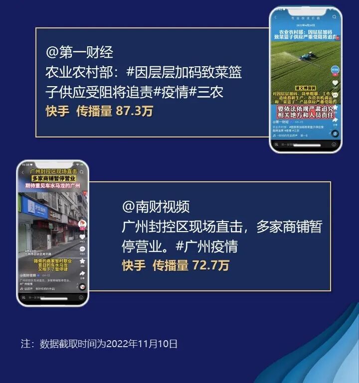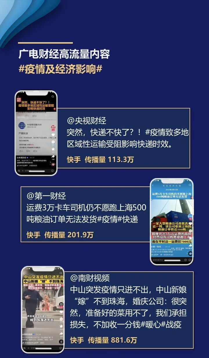 今年新冠疫情频发,多地多次出现疫情严重的情况,对地方经济存在一定影响,#疫情经济影响#也成为吸引用户高传播、高评论的内容。如广东台@南财视频在快手平台发布的《中山突发疫情只进不出,中山新娘“嫁”不到珠海,婚庆公司:很突然,准备好的菜用不了,我们承担损失,不加收一分钱#暖心#战疫》视频揽获近900万传播量。视频将镜头对准事件发生的第一视角,由于疫情防控要求,婚车在封控路口被迫掉头,并结合车主的自述,展现特殊时期对婚姻公司和当事人的突然打击,聚焦疫情影响的基础民生经济情况。从小切口看出大环境的变化对中小民营企业的经营管理等方面带来了或多或少的影响。