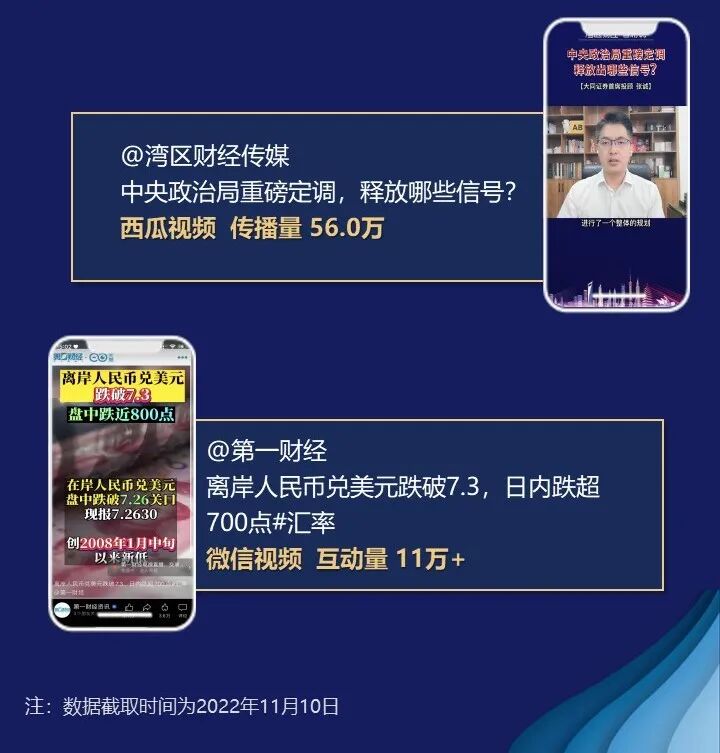 广东台@南财视频发布的短视频同样聚焦财经资讯、股市动态,且兼顾本地经济、营商环境、企业发展等内容,如大湾区经济圈建设、华为收缩边缘业务等多条内容均揽获超500万传播量。值得关注的是,@南财视频在抖音、快手平台均开设“南财观察|每周深度财经观察”合集,每周更新一条,聚焦热点财经事件、最新经济数据、商业传奇故事等深度解析其背后的财经相关问题及发展走势。比如,其10月份针对世界杯发布的短视频《#南财观察丨先声夺人卡塔尔世界杯的“中国制造”》,在快手平台传播量超560万。