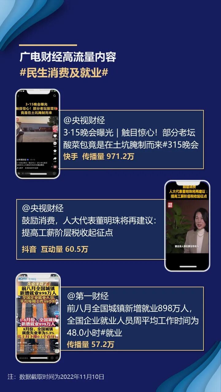 通过观察47个广电财经账号今年1-10月发布的短视频,梳理播放量及互动量TOP100内容发现,高流量内容中#国内外经济形势#、#民生消费及就业#、#疫情经济影响#、#股市楼市#等热门话题受到用户高关注。