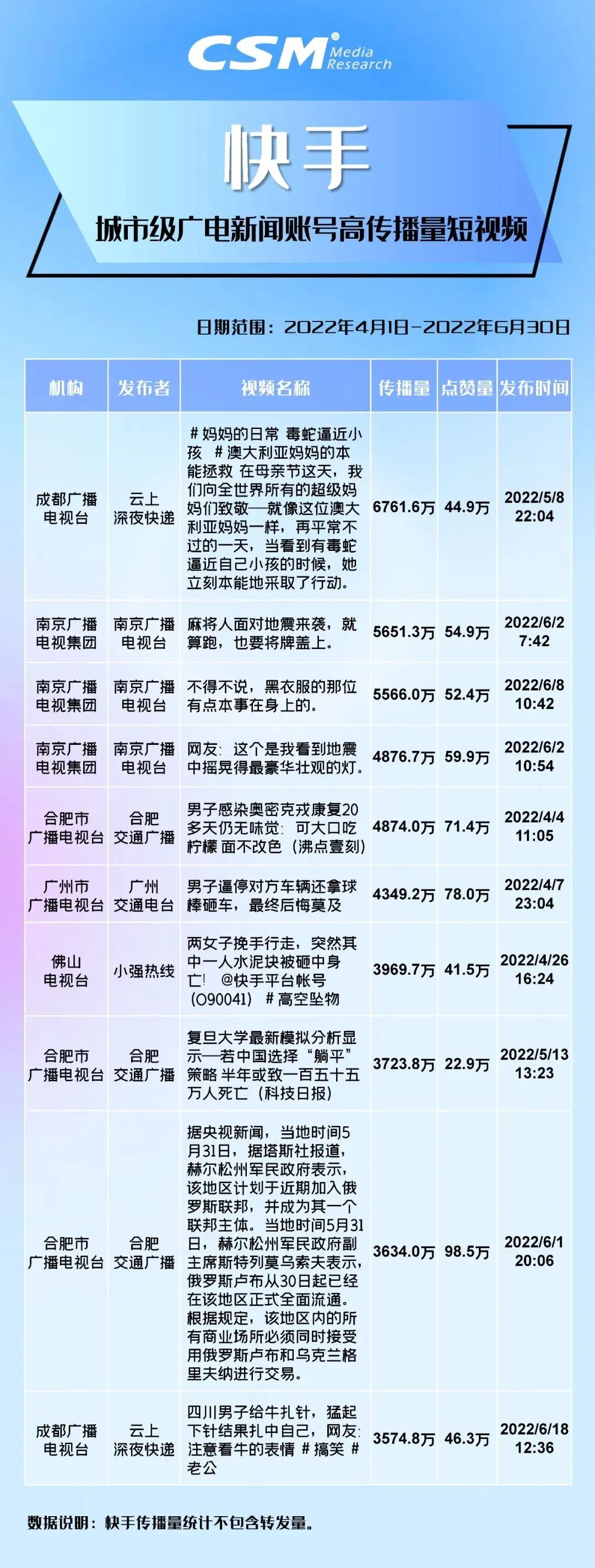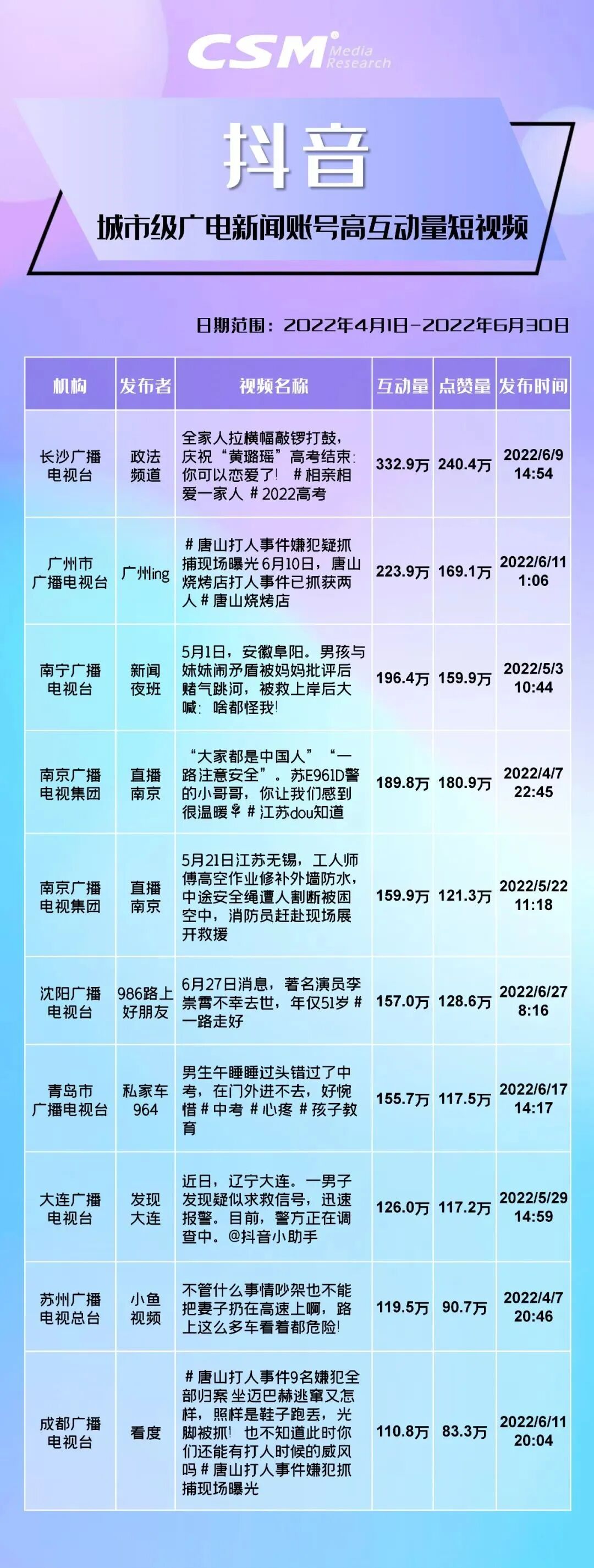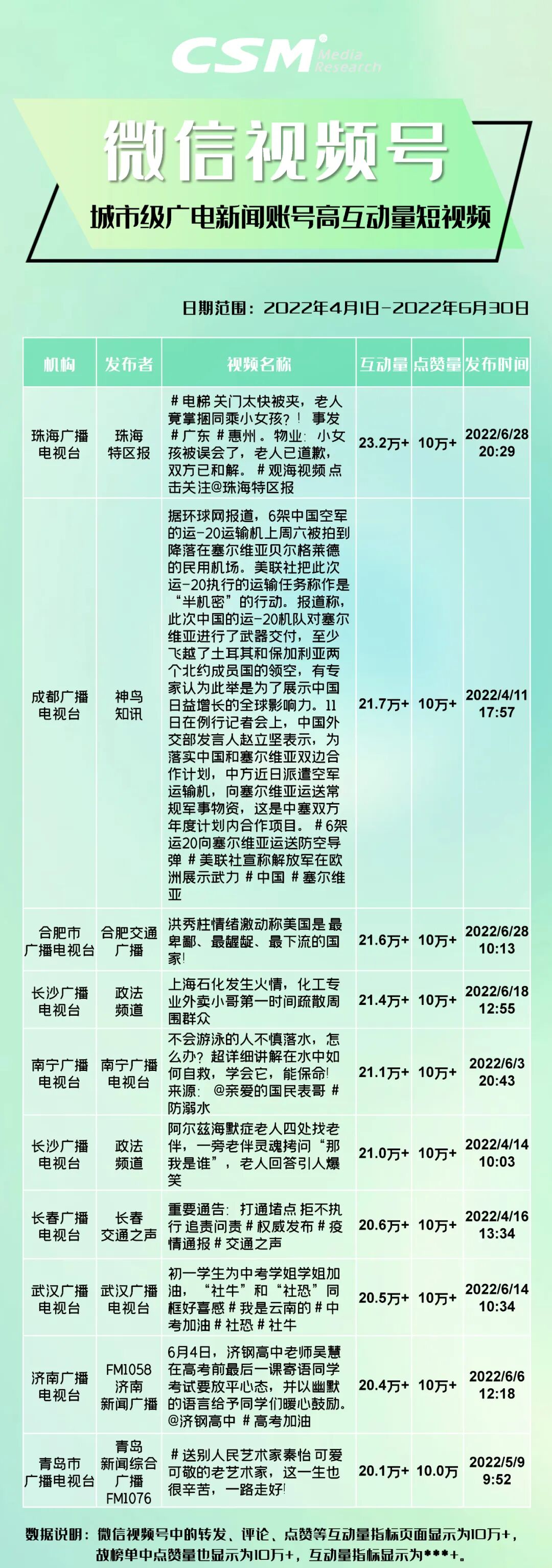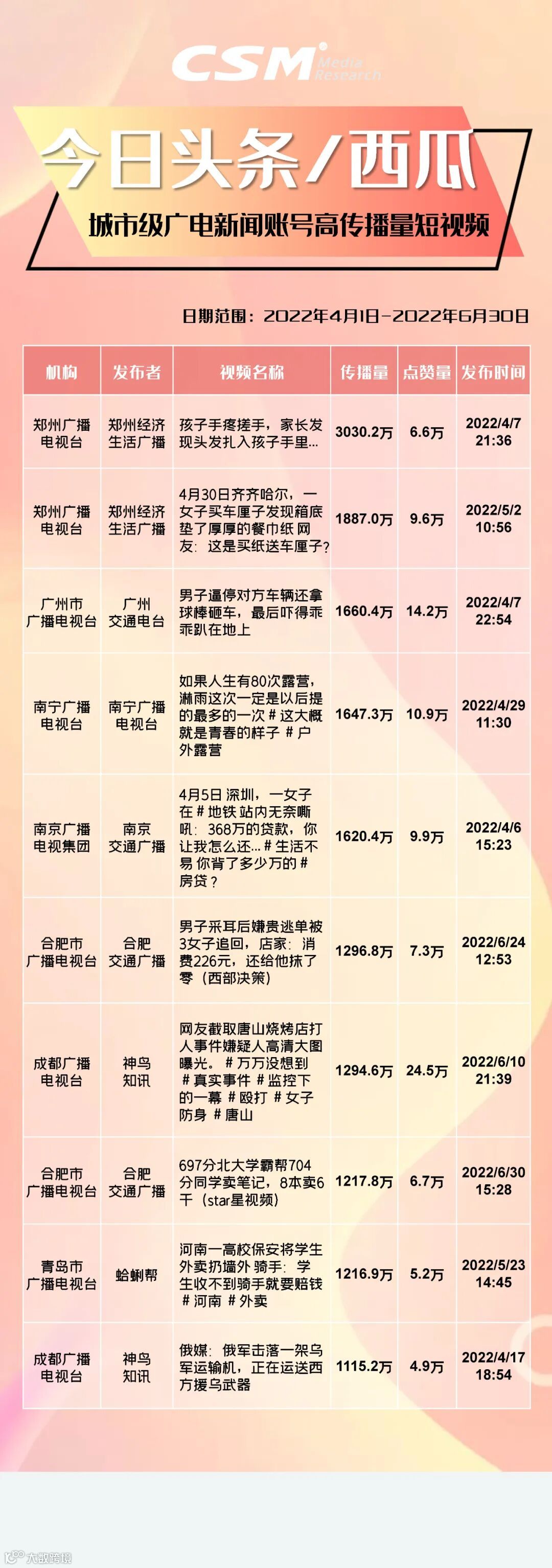 CSM持续追踪广电媒体在新媒体平台传播表现,以下是根据CSM“V +Scope”融合媒体云平台数据,整理得出2022年第二季度在抖音、快手、今日头条、微信视频号四大平台,获得高互动量和高传播量的城市台广电短视频与业界分享。
