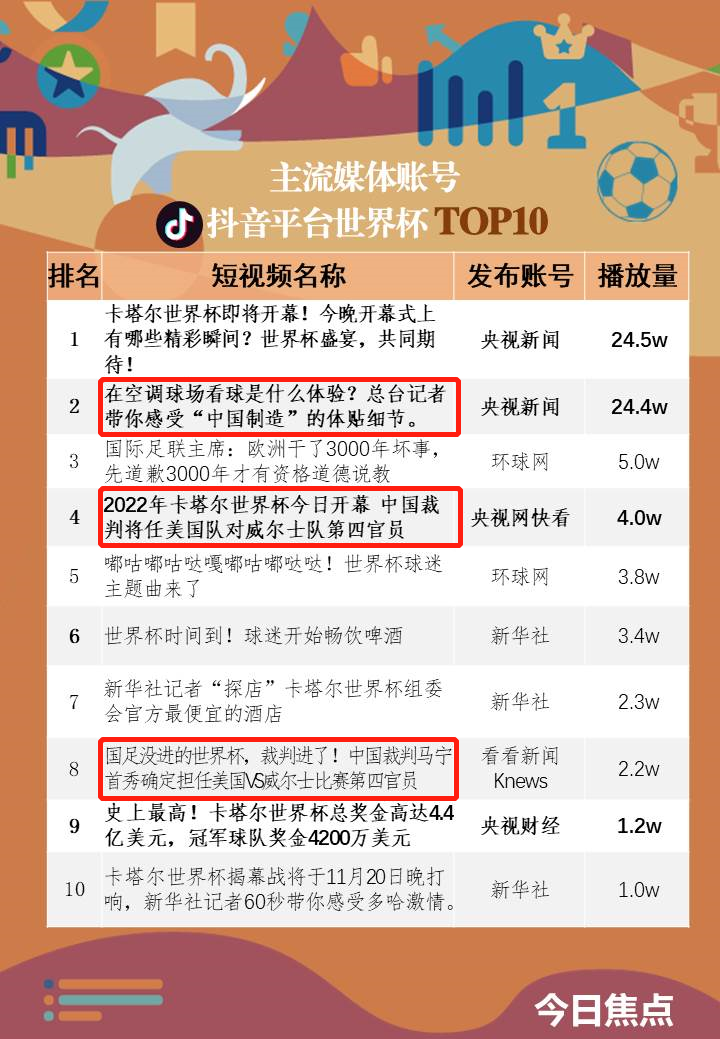 在中央广播电视总台发布的2022年卡塔尔世界杯《象舞指数榜单》中可以看到,在多个平台的热门短视频中,不乏“金钱”相关的主题,包括东道主的豪掷千金,包括参赛队未来的奖金分配,都能杀进点击量的前十名。