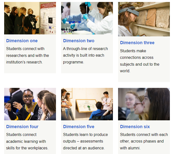 这个维度侧重于明确学生与研究以及研究机构建立联系,并可时常参与到与他们学习相关的研究当中去。通过与研究人员的对话,学生们对他们所在领域的最新研究提出自己的分析思考。