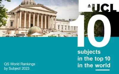 在3月22日QS公布的学科排名中,UCL有 10 个学科领域名列全球前 10,分别是教育(1)、建筑与建筑环境(1)、考古学(3)、人类学(4)、药学与药理学(4)、心理学(5)、地理学( 6)、医学 (6)、解剖学与生理学 (6) 和生物科学 (8)。