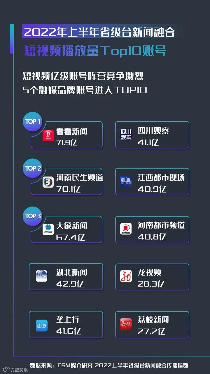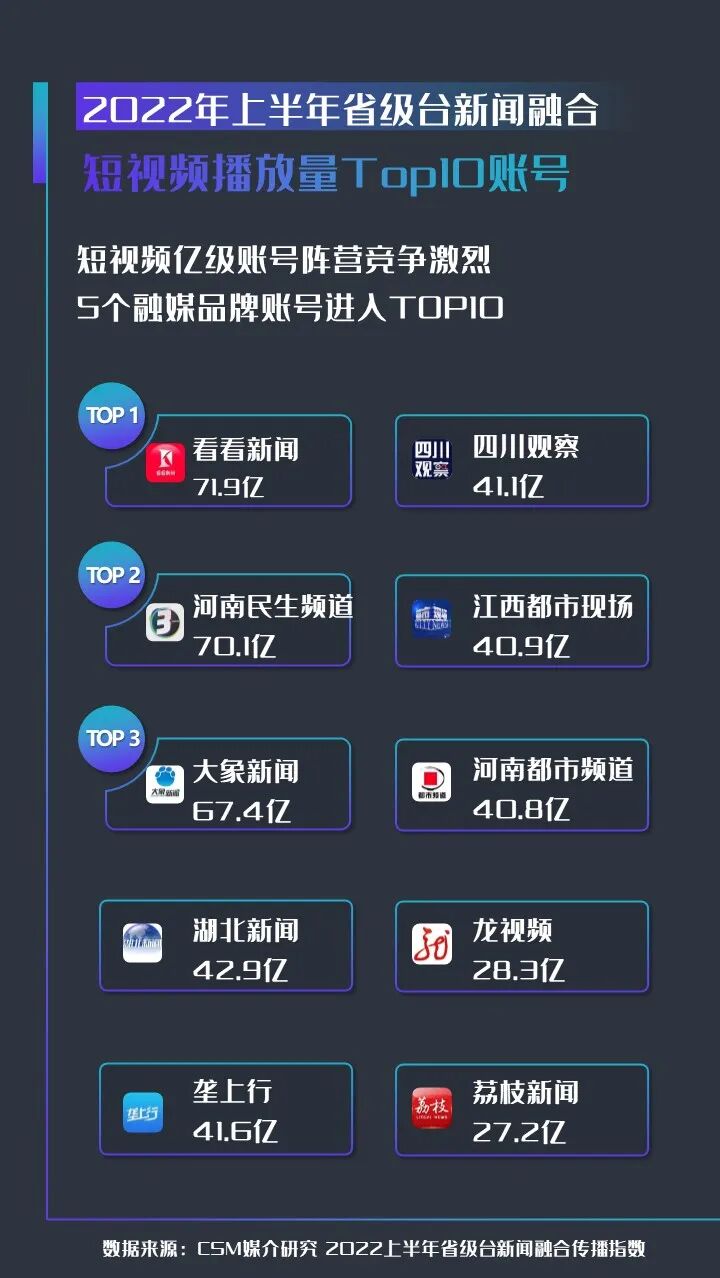 CSM媒介研究监测省级台新闻账号在今日头条、腾讯新闻、抖音、快手、微信视频号等5个平台发布的内容发现,在2022年上半年连续25周的监测中,@看看新闻、@大象新闻、@四川观察、@湖北新闻4个账号每周发布的内容均进入各平台高流量内容TOP20,账号内容传播力占据优势;@荔枝新闻、@垄上行2个账号发布的内容,共23周进入各平台高流量TOP20。