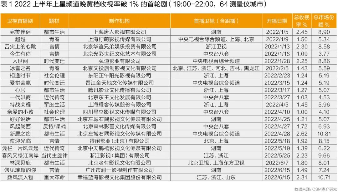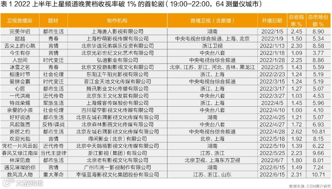 上半年电视剧市场在生活化表达、真实性表达和年轻化表达上力图实现“1+1+1”三突破,整体呈现出风格自然灵动、题材变化多端的格局。从CSM 64个测量仪城市数据来看,我国上星频道电视剧市场呈现出如下主要特征。