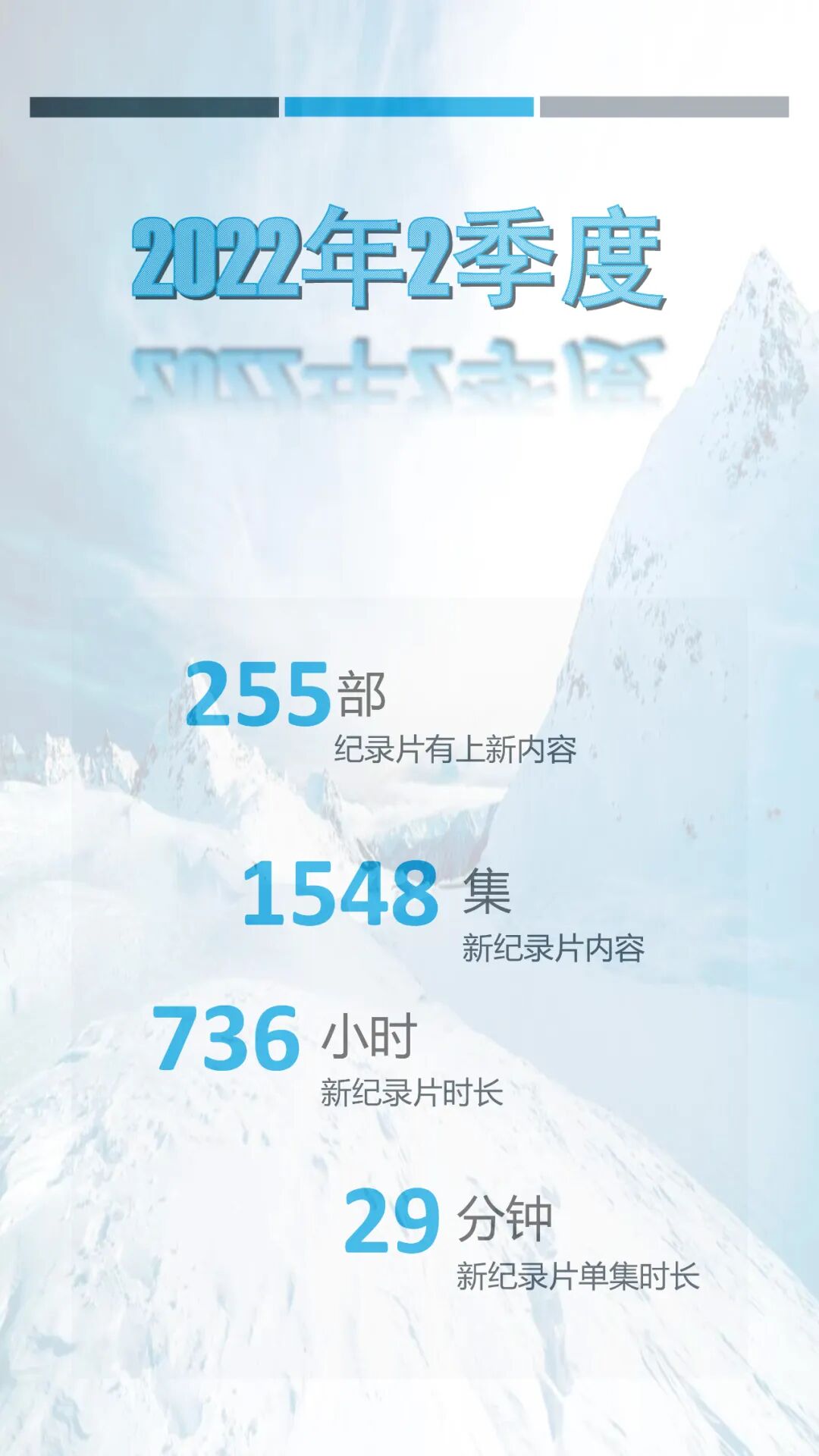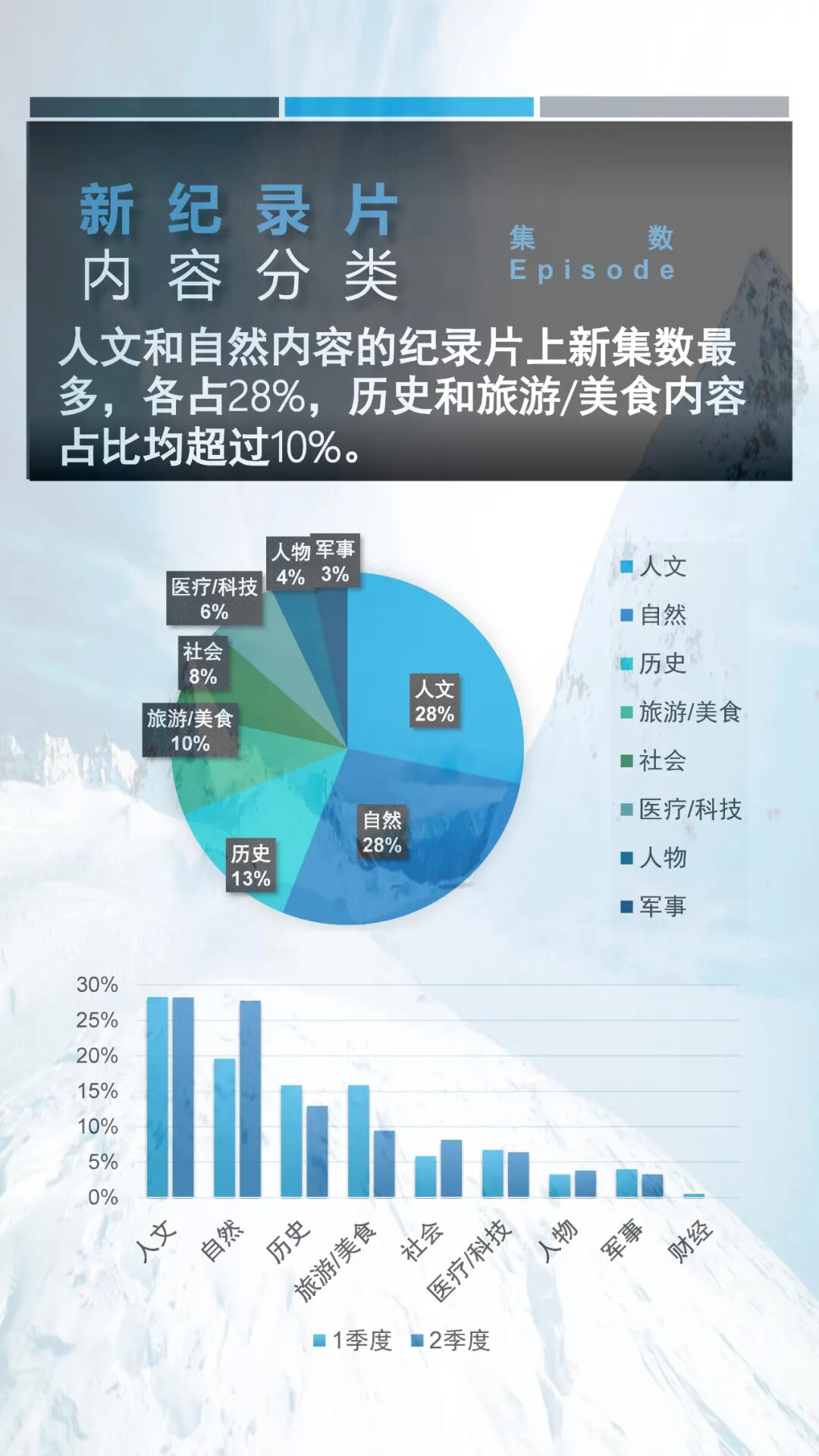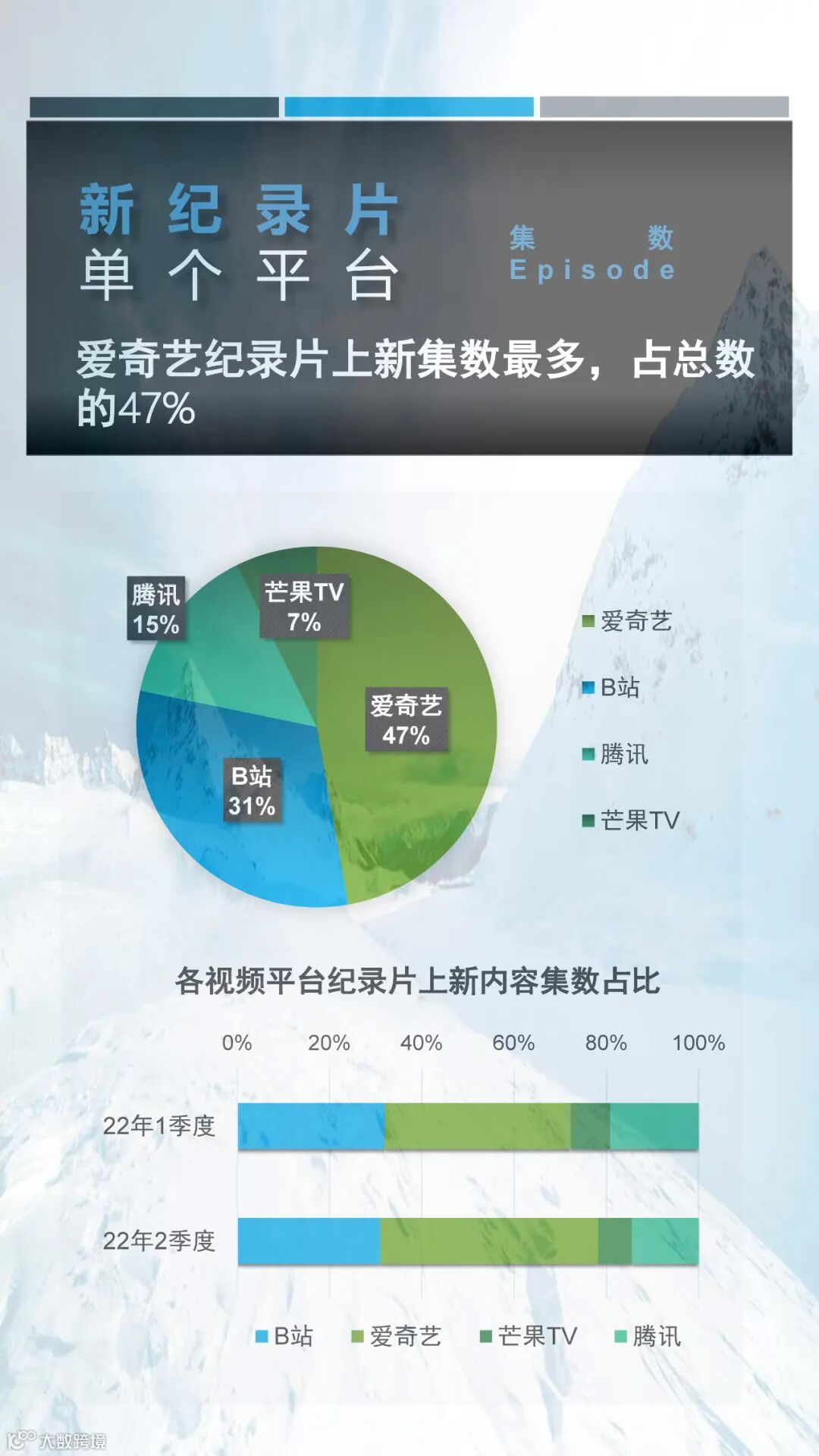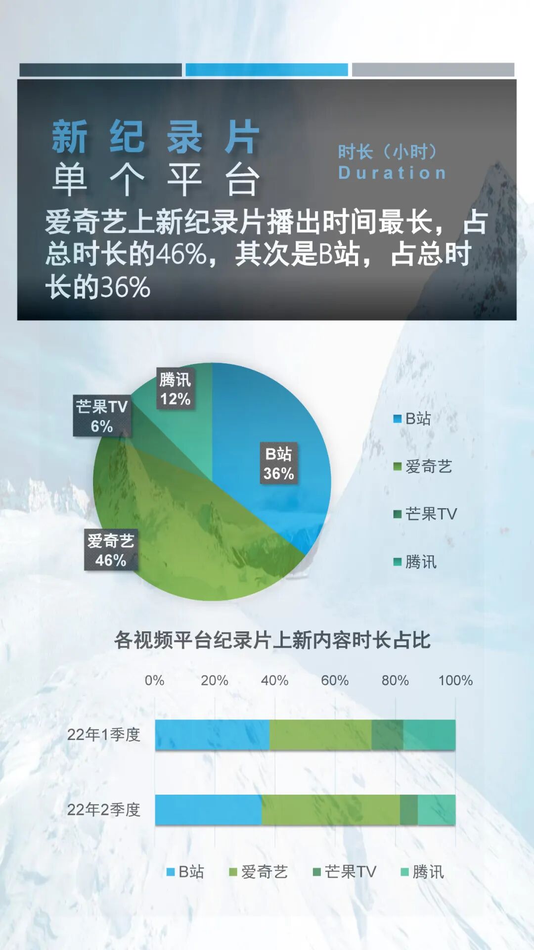 就内容而言,2022年第二季度网络新纪录片中人文类与自然类纪录片上新集数最多,占据二季度总上新集数的50%以上。而从平台的纪录片上新分布看来,不论是从上新纪录片总集数还是上新纪录片播放总时长,爱奇艺都遥遥领先于其它平台,这或许跟爱奇艺在纪录片运营上的剧场化策略有关。更多详细信息请参阅以下内容。