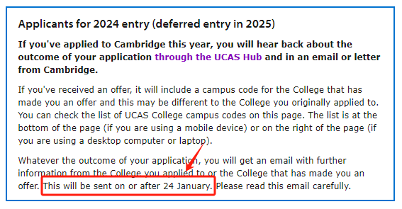 剑桥大学在其官网公布,所有学生都将在1月24日及之后收到是否被录取的通知。你会在UCAS中心及剑桥大学的电子邮件收到有关申请结果的信息。