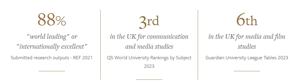 数字传媒属于利兹的艺术、人文与文化学院(QS榜单上排名世界第44)旗下的媒体与传播学院(2023完整大学指南中英国排名第6)。
