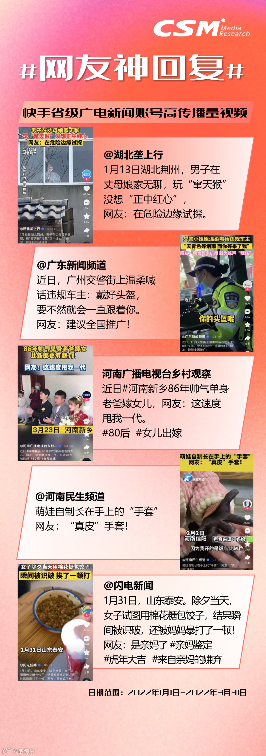 本文根据CSM“V +Scope”融合媒体云平台数据整理得出,其中本次关键词词频统计数据为监测范围内所有省级台新闻账号在2022年1季度的内容发布,数据记录截止时间为内容发布后7天,本篇为快手平台篇。