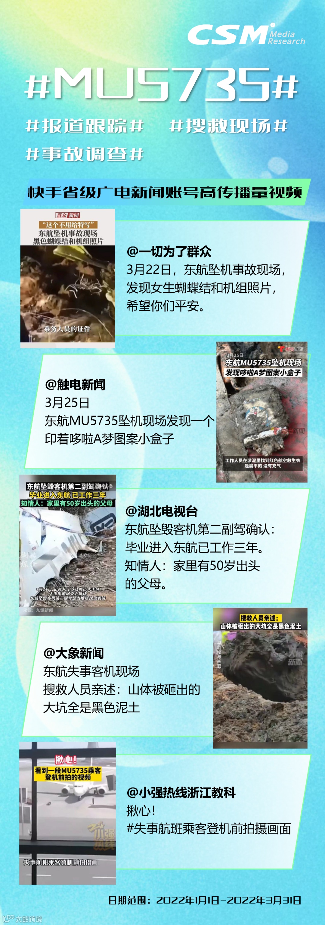 2022年1季度快手平台省级新闻广电账号“MU5735”关键词总发布量近4800条,总传播量超34亿。