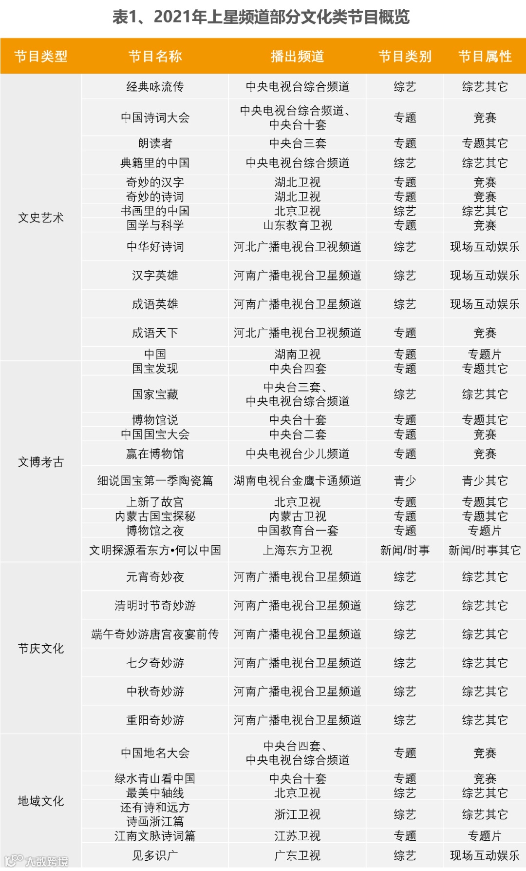 观察当前上星频道热播的文化类节目,以其所聚焦的文化内核为区分,可大致将其划分为四种类型:文史艺术类、文博考古类、节庆文化类和地域文化类(表1)。