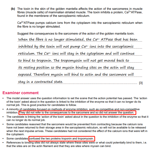 有些同学推断,由于 calcium ions 没有回到 sarcoplasmic reticulum 中的储存区,因此在下一次 impulse 到来时将无法重新释放,从而 sarcomere 的收缩会被阻止,但其实这些考生没有考虑留在细胞质中的 calcium ions的影响;