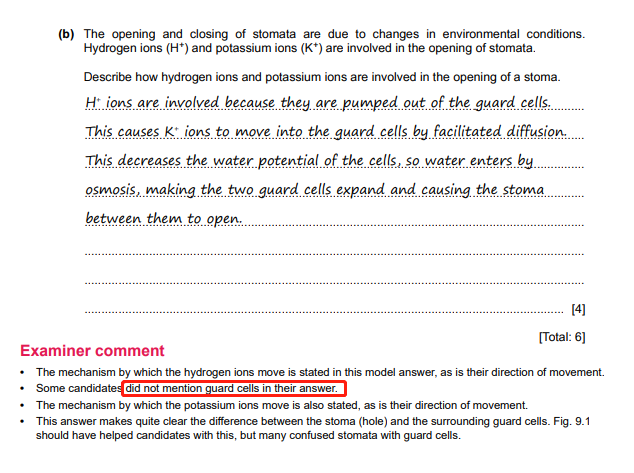 在这个示范答案中指出了 hydrogen ions 的移动机制,以及它们的移动方向,也很清楚地说明了 stoma 和周围 guard cells 之间的区别;
