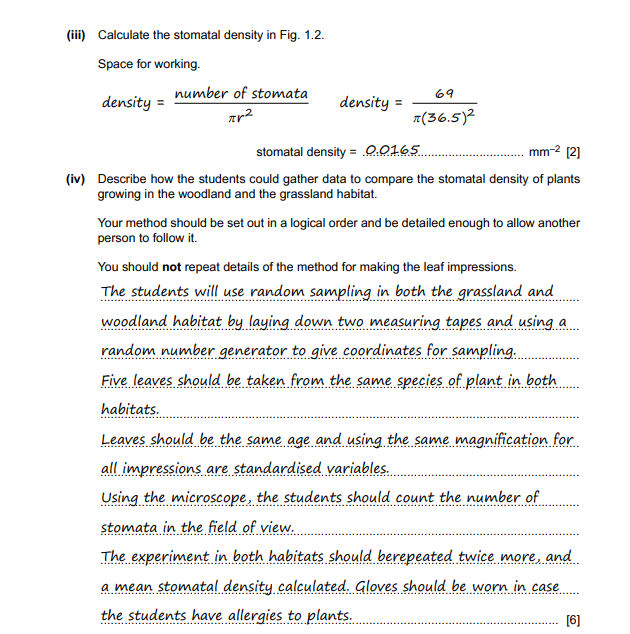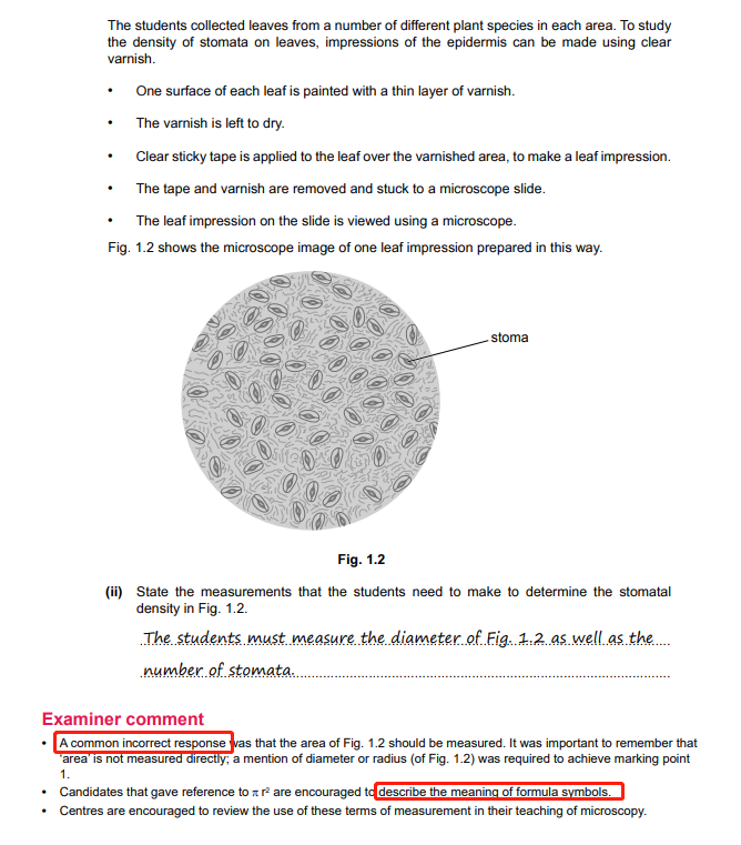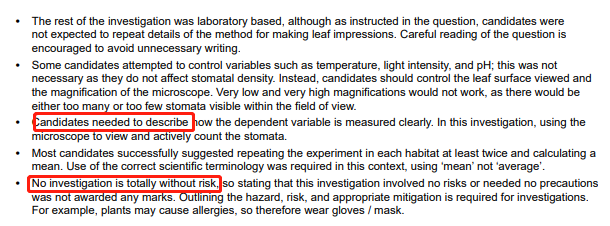有些考生试图控制温度、光照强度和pH值等变量,这是没必要的,因为它们不会影响 stomatal intensity 。相反,考生应该控制观察到的叶片面积和显微镜的放大倍数,放大倍数过低或者过高都是不行的,否则在视野范围内,stoma 要么太多,要么太少;