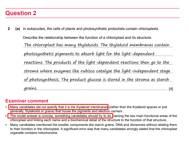 我们可以看到考官给出的示范答案很简洁,这也是每个考生应该要做到的。说出 chloroplast的两个主要功能区,并将每个结构的名称、生化细节及其功能联系起来;