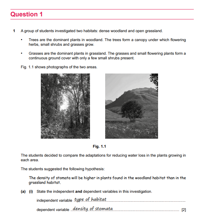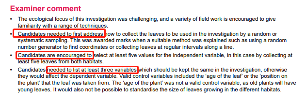 考生需要列出至少三个在调查中应保持不变的变量 (control variables),否则它们会影响 dependent variables 。有效的 control variables 包括 " age of the leaf "或 " position on the plant "。" age of the plant "不是一个有效的 control variable ,因为老的植物也会有嫩叶,同时也不可能对生长在不同栖息地中的叶子的大小进行标准化;