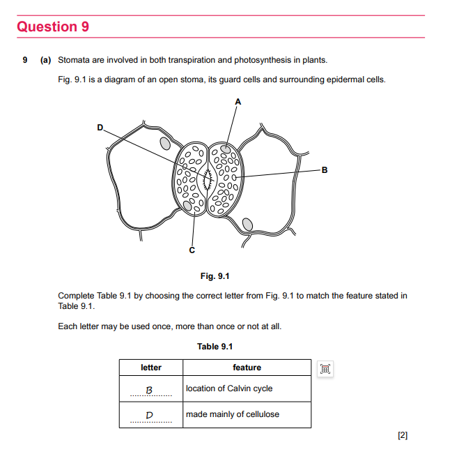 图9.1对考生答题而言其实是有很大帮助的,但许多人混淆了 stoma 和 guard cells ;
