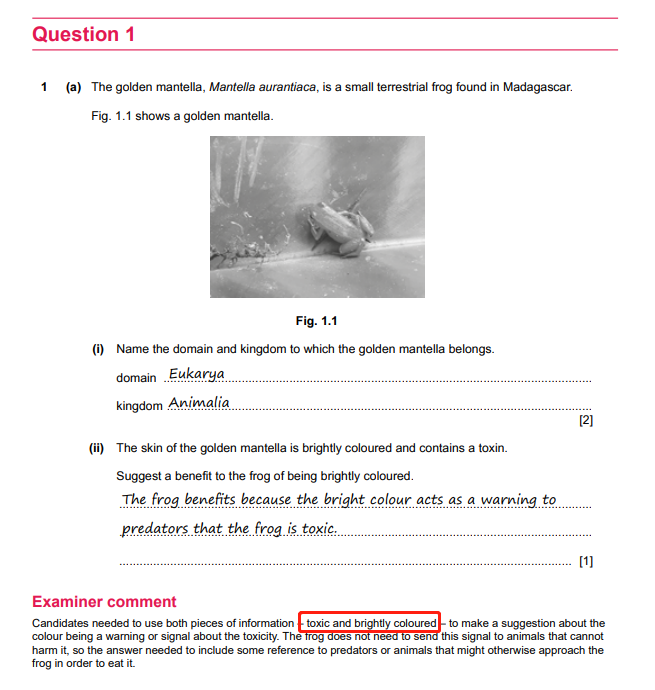 在这道题中,考官提示到考生需要利用【有毒和颜色鲜艳】这两个信息(暗示颜色是关于毒性的信号),青蛙不需要向不能伤害它的动物发出这种信号,所以答案中需要提到捕食者或是接近并吃掉青蛙的动物。
