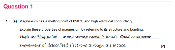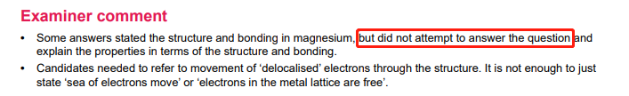 在这道题中,部分同学回答了镁的结构和化学键,但没有回答题干中的问题,也没有从结构和化学键的角度来解释其特性。