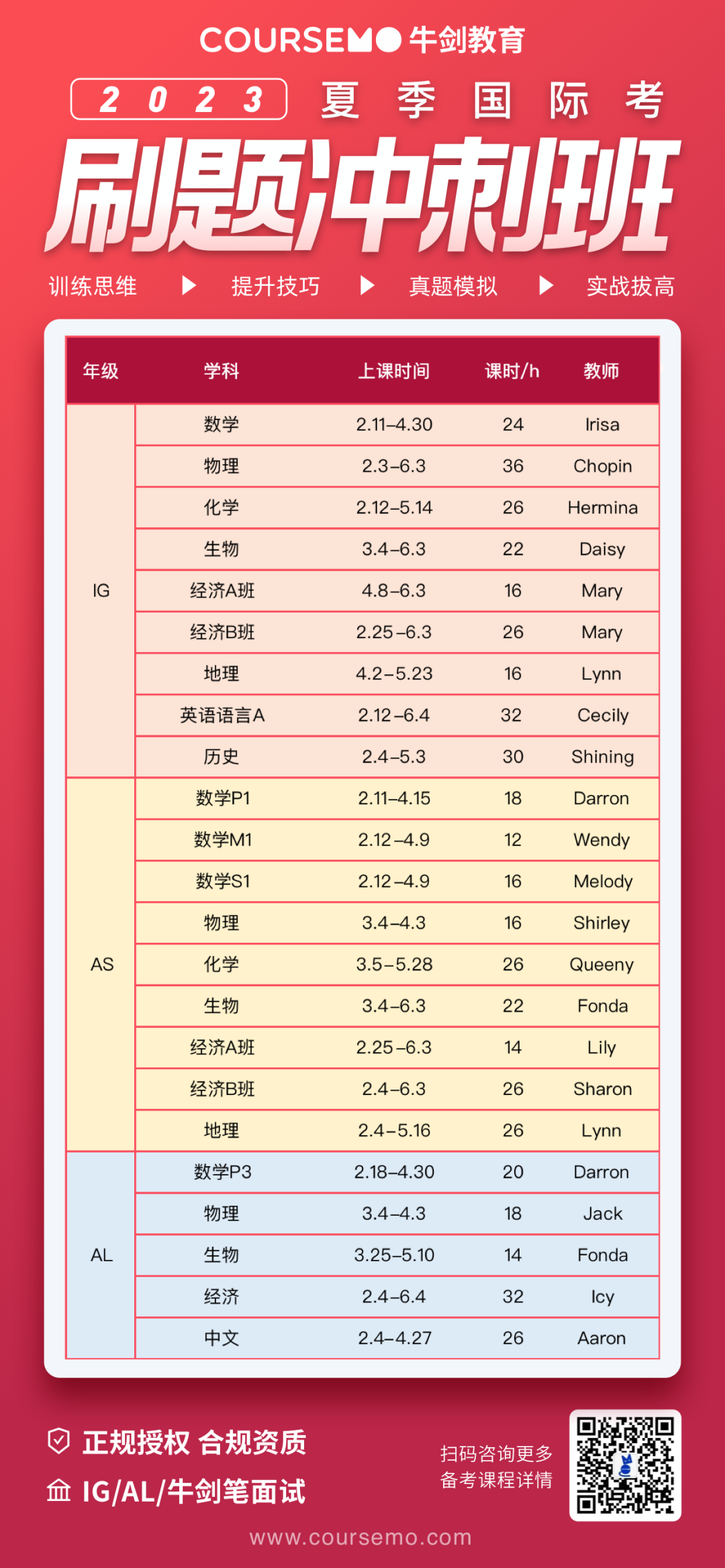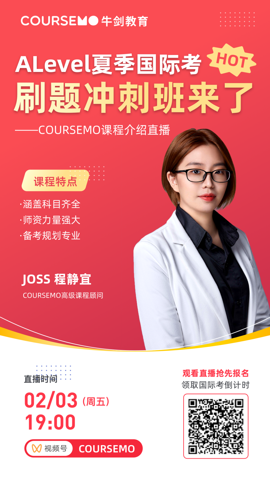 希望跟着COURSEMO提升化学及其他更多课程、冲刺夏季国际考的同学,记得关注COURSEMO在本周五(2月3日)的直播,将进行2023年夏季国际考备考班课的详细介绍!我们周五见!