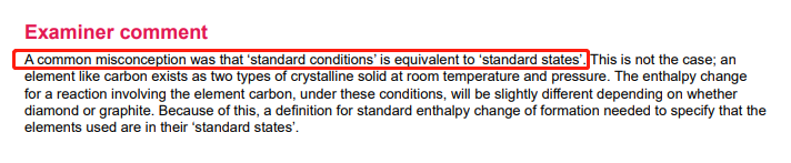 在这里有一个常见的误解,"标准条件 "等同于 "标准状态"。事实并非如此。像碳这样的元素在室温和压力下以两种结晶固体的形式存在,在这些条件下,涉及碳元素的反应的焓变将根据钻石或石墨的不同而略有不同。正因为如此,标准形成焓变的定义需要说明所使用的元素是在它们的 "标准状态"。