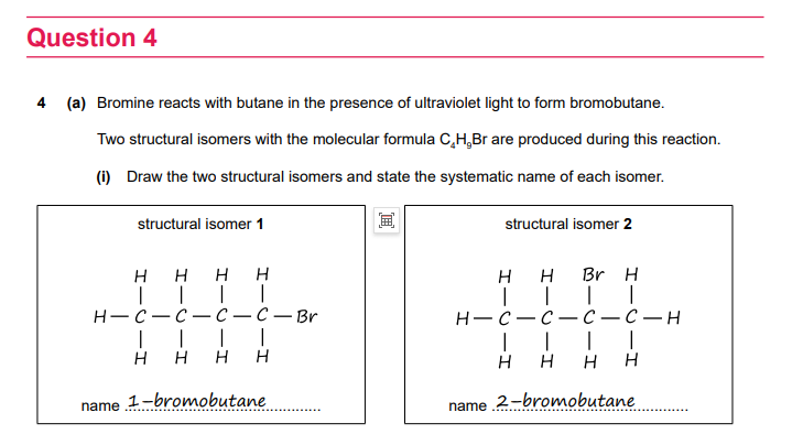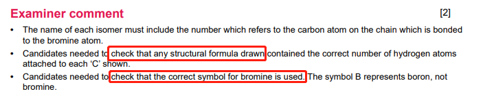 考官在这里指出了三个注意事项,首先每种异构体的名称必须包括指与溴原子结合的链上碳原子的数字。其次考生需要检查所画的任何结构式是否包含连接到每个 "C "上的正确的氢原子数,还需要检查所使用的溴的符号是否正确,符号B代表硼,而不是溴。平常比较容易粗心的同学就要特别注意这样的题目。